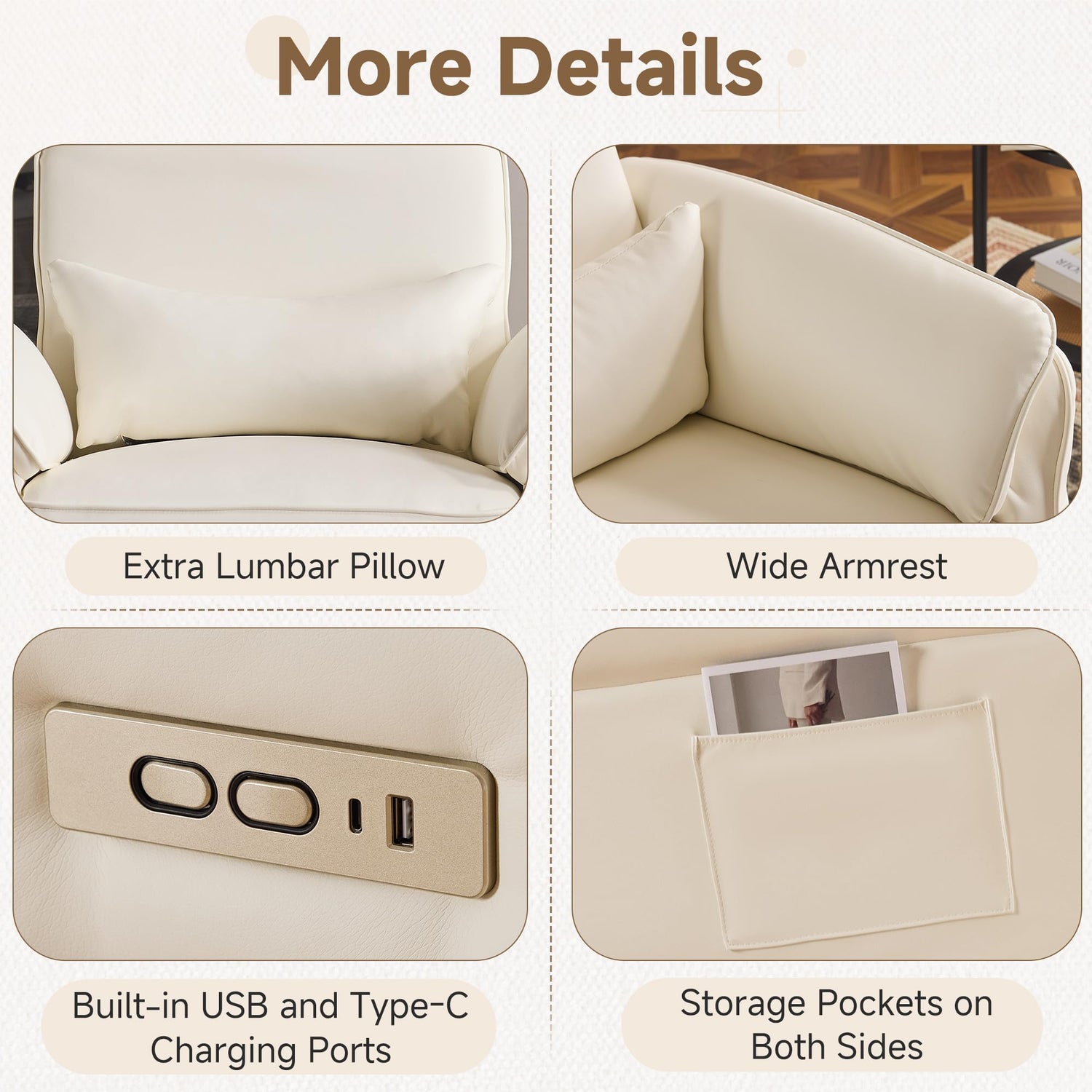 - [Convenience Design] This nursing chair has built-in USB and Type-C charging ports, making it easy to charge your mobile devices, staying connected while caring for your baby. Plus, convenient side pockets keep books, magazines, and baby essentials within easy reach.