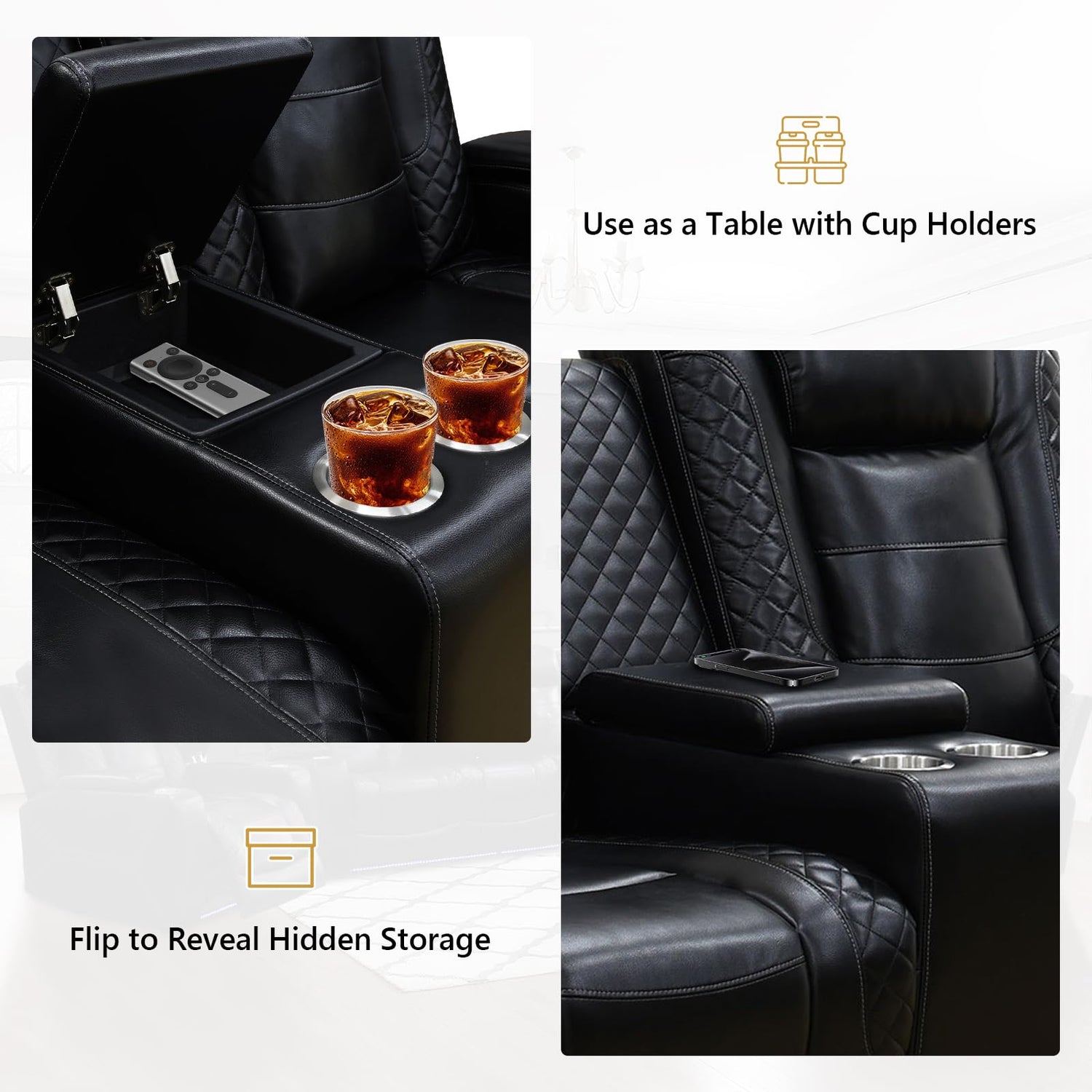 Details: Power Reclining Loveseat Sofa for Home Theater, PU Leather Wall Hugger RV Recliner with Console, 4 Cup Holders, USB & Type-C, LED Lights, 170° Adjustable Backrest, Black