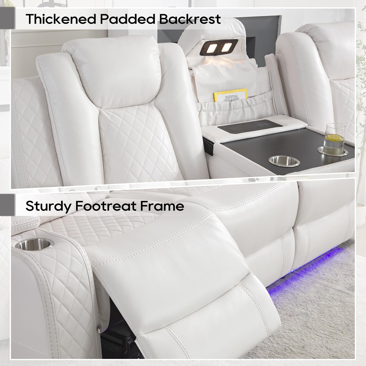 Power Reclining Sofa Couch with Wireless Charger, 3 Seaters with Recliner with Reading Light, Leather Electric 3 Seat Sofa Sectional Set for Living Room, Home Theater Seating with LED Lights, White