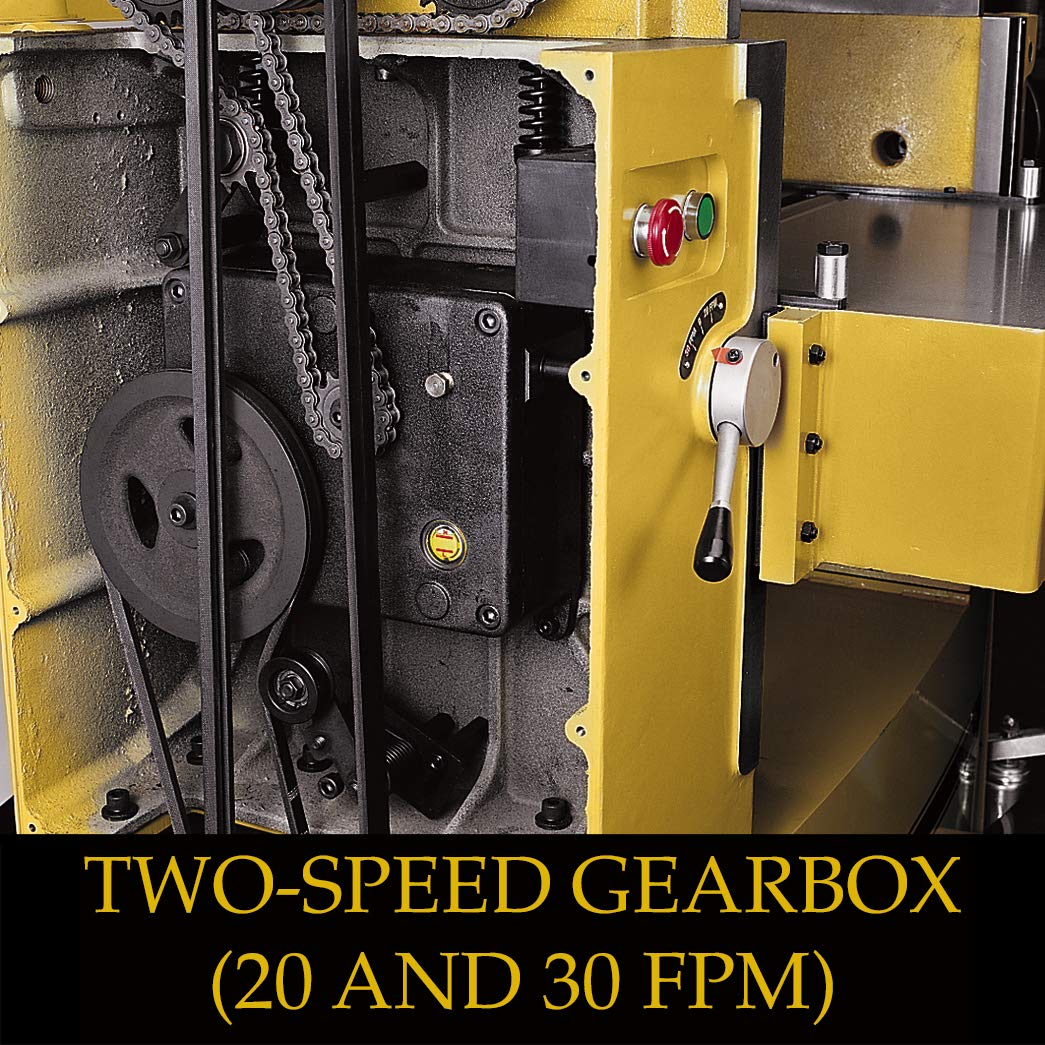 This 1,300-pound heavy duty cast iron planer offers rock solid rigidity and accurate planning for years to come. The hinged top allows easy access to the rollers and knives, and has a 5-Inch dust port for easy attachment to any dust collection system. The cutterhead is a helical design with 150 four sided knife inserts, these produce a superior finish and much quieter operation compared to conventional cutterheads, and the inserts are installed without further adjustments. The anti-kickback fingers and pressure bar are located in close proximity to the cutterhead for an exceptional finish. Infeed and outfeed rollers are fitted with roller bearings for long life. The sectional infeed roller and chip breaker are specially designed to allow multiple boards to be planed at the same time. The adjustable bed rollers facilitate both rough and finish planning. The solid steel outfeed roller is machined with small serrations to insure a smooth finish yet provide positive feeding. The two-speed gearbox with machined detents is quickly changed up front when switching from rough to finish work. The massive, ribbed cast iron table is ground finished and rises smoothly via the hand wheel. With a hefty 7-1/2 HP motor, the 201HH planer is perfect for the small to medium shop with continuous planning requirements.