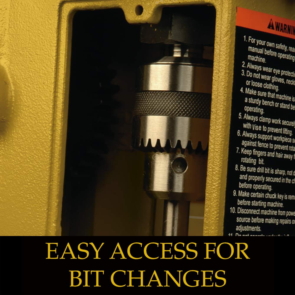Sturdy cast iron construction for optimal stability and durability Quick position table mounted swiveling vise clamp for angled work pieces Feed lever features six positions for quick adjustments Table and fence tilt from 0 to 35 degrees for a wide variety of applications Gas cylinder controlled rack and pinion head raising and lowering system for smooth operation Quic