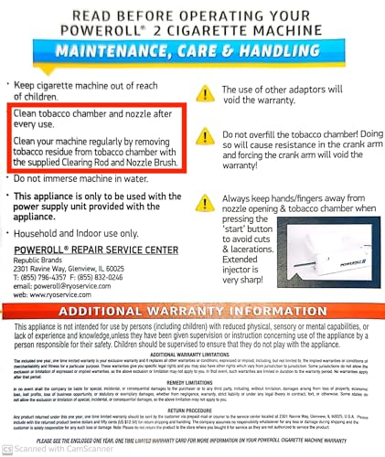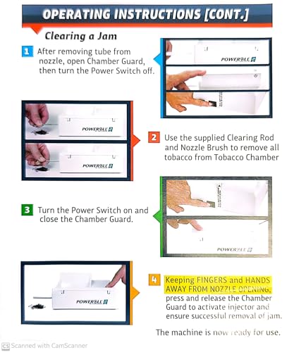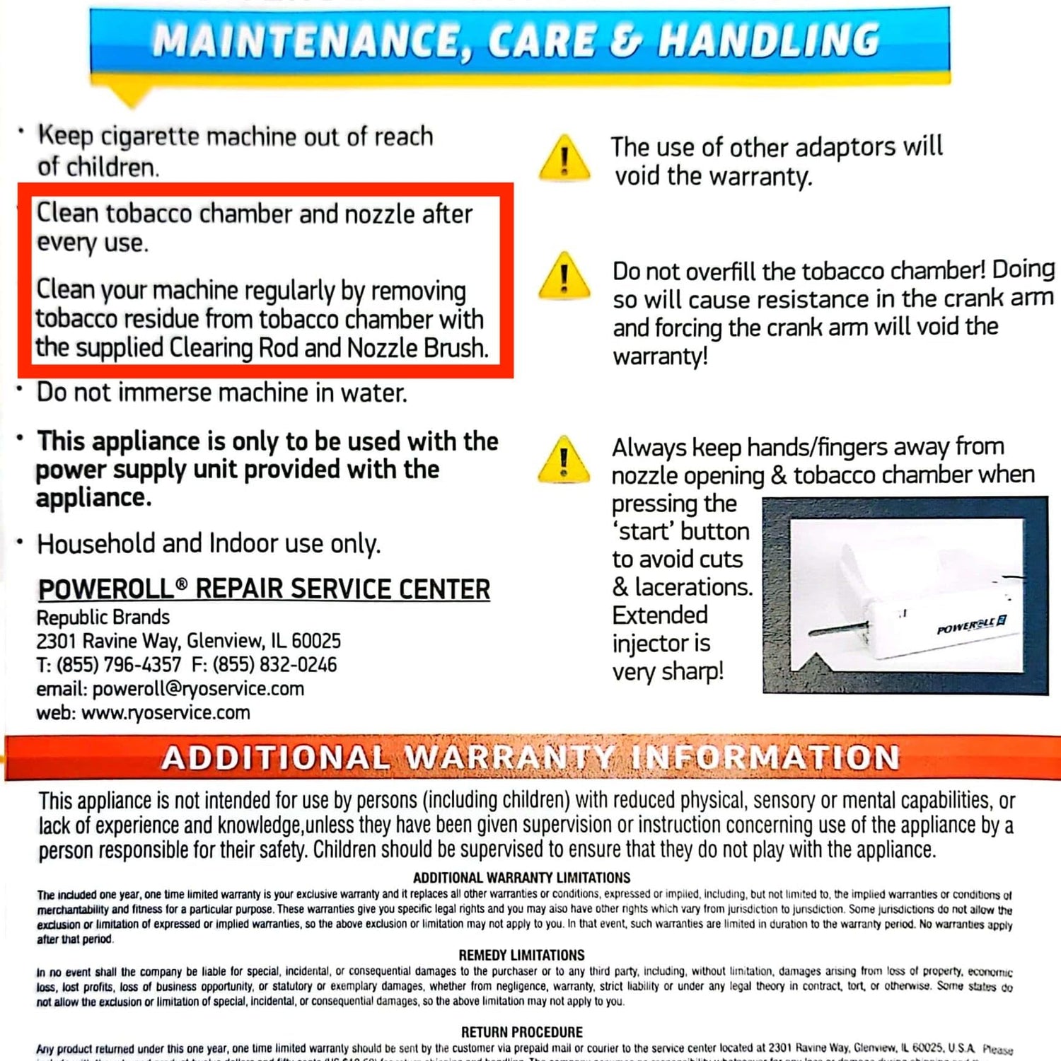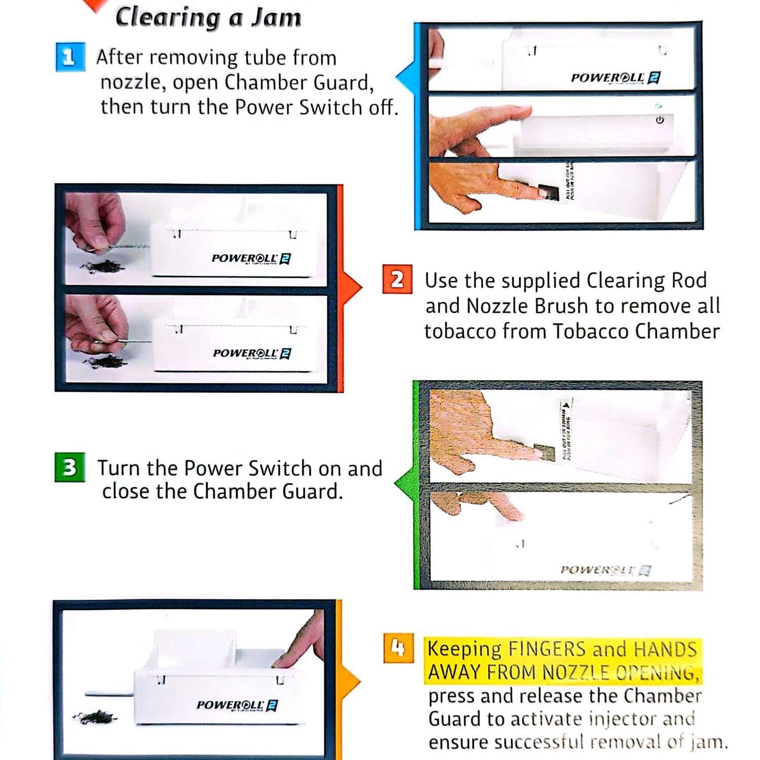 Details: - Clean tobacco chamber and nozzle after every use. - Clean your machine regularly by removing tobacco residue from tobacco chamber with the supplied Clearing Rod and Nozzle Brush. - Do not use moist tobacco - Do not use excess tobacco into the chamber