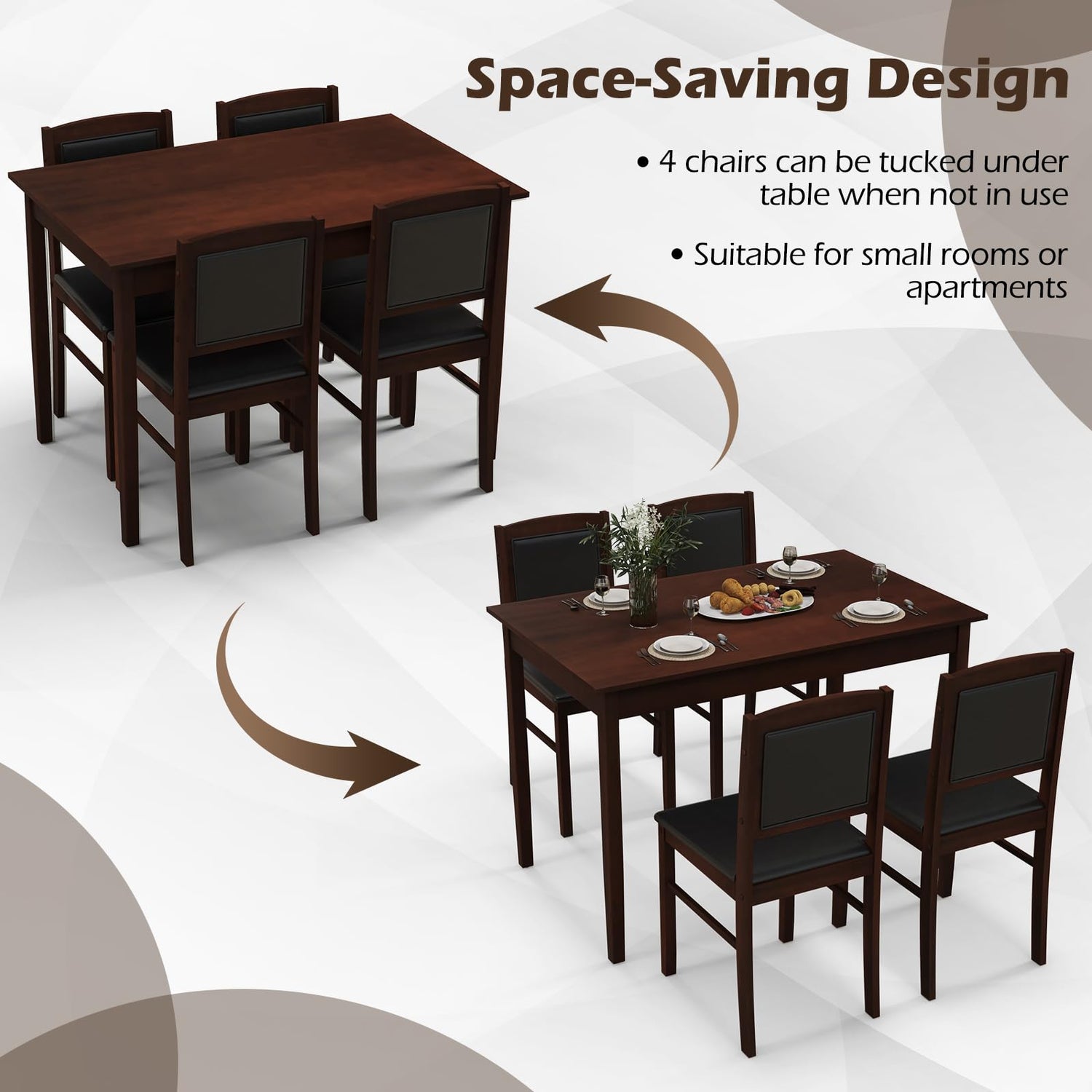 POWERSTONE Farmhouse Wood Dining Table Set for 4, Space-Saving Kitchen Table 4 Chairs Paded PU Leather, Rectangular 5 Piece Dining Table Set 4 Rubberwood Legs Chairs for Kitchen Indoor Dinner (Brown)
