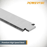 Details: Product Description Introducing the 13 Inch HSS Planer Blade (2pc) Set by POWERTEC. These wood cutting accessories are intended to serve as premium replacement blade knives for your planer. Each planer blade possesses impressively sharp, reversible dual cutting edges that produce high precision cutting action for a variety of woodworking applications. Premium Build Designed with a high speed steel construction that offers a combination of durability, along with wear and heat resistance. Whether you're a professional or hobbyist, HSS blades allow you to cut at higher speeds when compared to traditional alloys. This not only improves your cutting capabilities, but your efficiency and workflow. They also come equipped with machined locator holes that help you safely align the knives to the planer cutting head with minimum effort. These planer blades fit and accommodate a wide range of industry leading planers, including: Ryobi: AC8630 AP1301 Blade Specifications Overall Size: 13-1/2" x 3/4" x 1/16" Length: 13-1/2" (344 mm) Width: 3/4" (19 mm) Thickness: 1/16" (1.8 mm) Material: HSS POWERTEC is a leading manufacturer of high quality woodworking tools and accessories, machines, and an assortment of OEM replacement parts. We are committed to exceeding expectations, while bringing the latest innovations, technology, and product development to the industry. From the Manufacturer POWERTEC High Speed Steel (HSS) Knives are made of premium High Speed Steel (HSS) with performance that meets or exceeds OEM product. The manufacturing process started with premium HSS material, followed by strictly professional machining and quality control that ensure extreme sharpness, precision, balancing, and tight tolerance in every piece of "POWERTEC HSS Knife" product. The final Heat Treatment enhances the hardness and durability. "POWERTEC High Speed Steel (HSS) Knives" stay sharp and last longer than conventional product. We guarantee that "POWERTEC High Speed Steel (HSS) Knives" meet or exceed OEM quality and industrial standard.