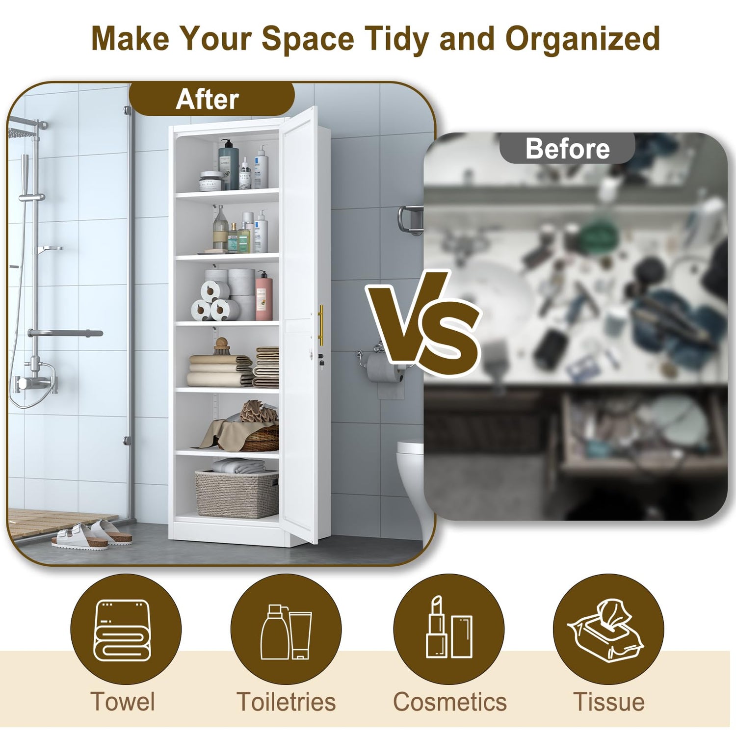 - 【WATERPROOF MATERIAL】: Tall narrow cabinet is composed of high-quality cold-rolled steel, adopt electrostatic powder coating technology, full metal coverage; waterproof, wear-resistant, high hardness, not easy to corrode, scratch-resistant, and easy to clean, Ideal storage unit for your bathroom and kitchen where grease and stains frequently occur.