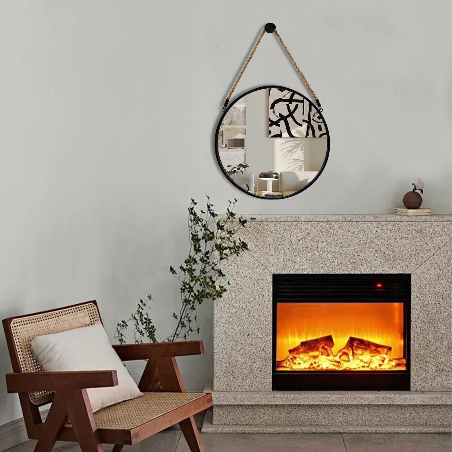 POZINO Round Mirror, 15" Rope Hanging Mirror, Farmhouse Circle Mirrors, Black Metal Frame Wall Mirrors for Bathroom, Bedroom, Living Room, Entryway, Fireplace, Home Decor