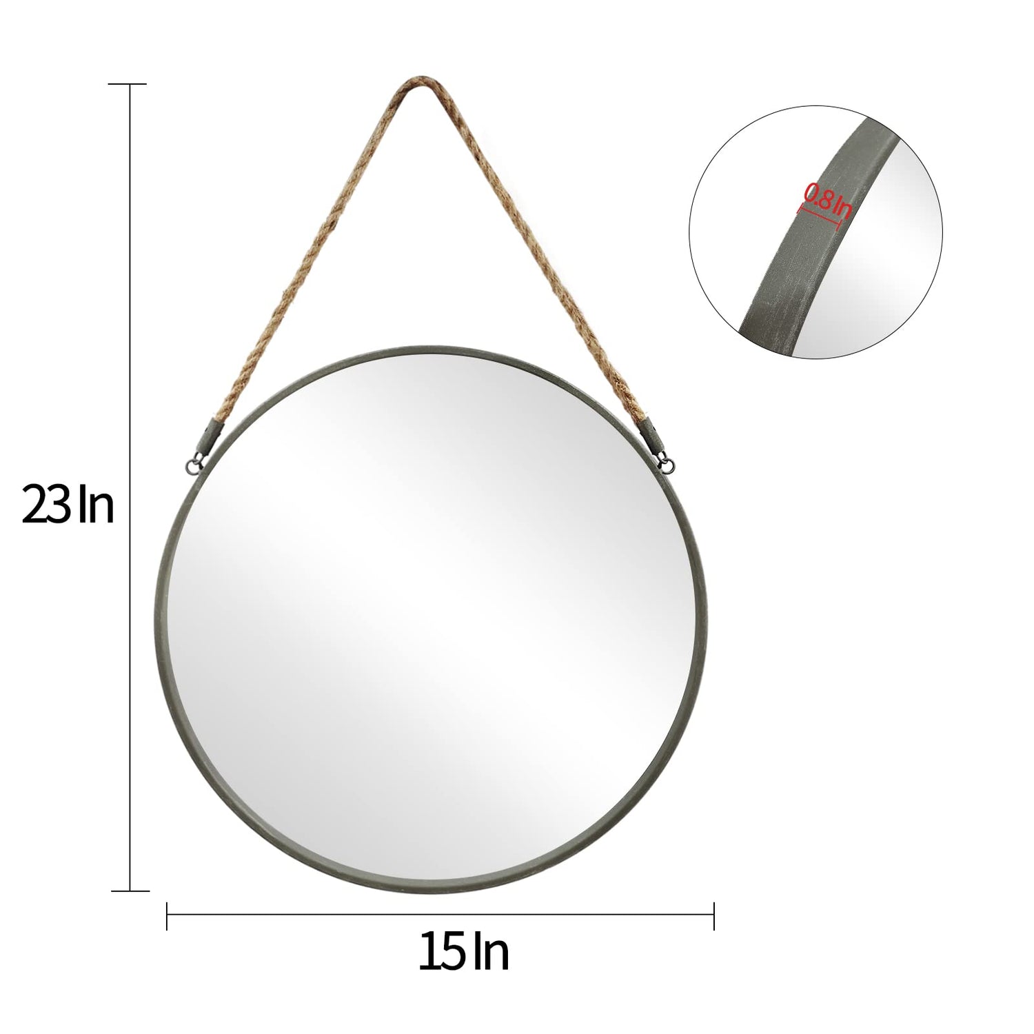 POZINO Round Mirror, Rope Hanging Mirror, 15 Inch Farmhouse Circle Wall Mirror for Bathroom Bedroom Living Room Entryway Home Decor, Grey