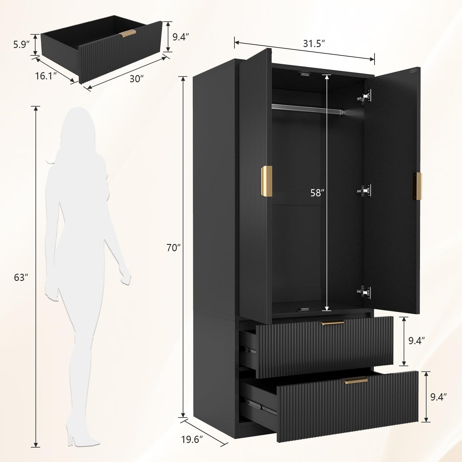 - Spacious Capacity: Measuring 31.5"*70"*19.6", this armoire wardrobe closet boasts an impressive storage capacity. It comes equipped with a versatile hanging rod and two spacious drawers, making it easy to organize various items. The hanging rod provides ample space for longer garments, such as dresses, suits, and trousers, ensuring your clothing stays neat and accessible