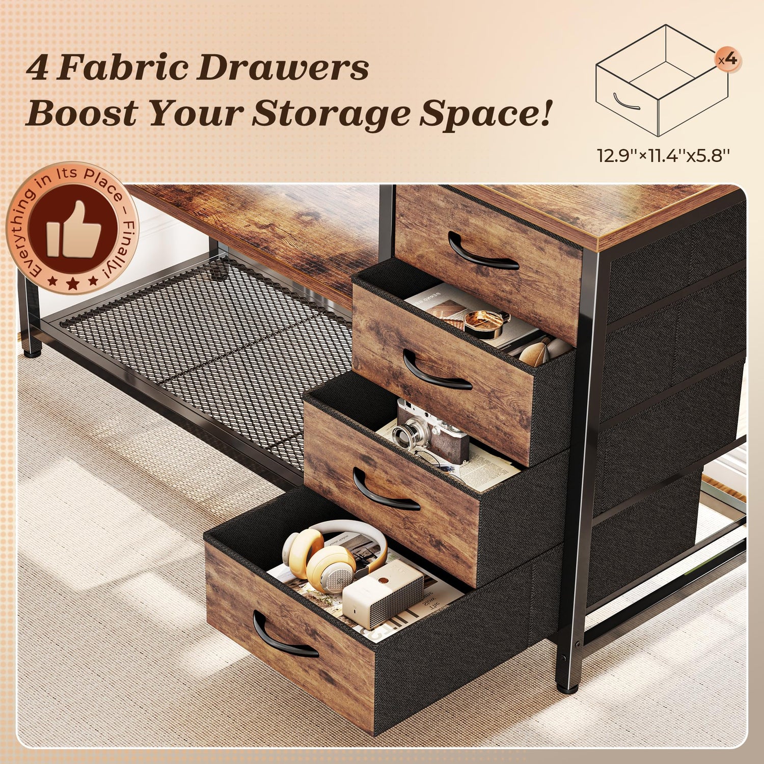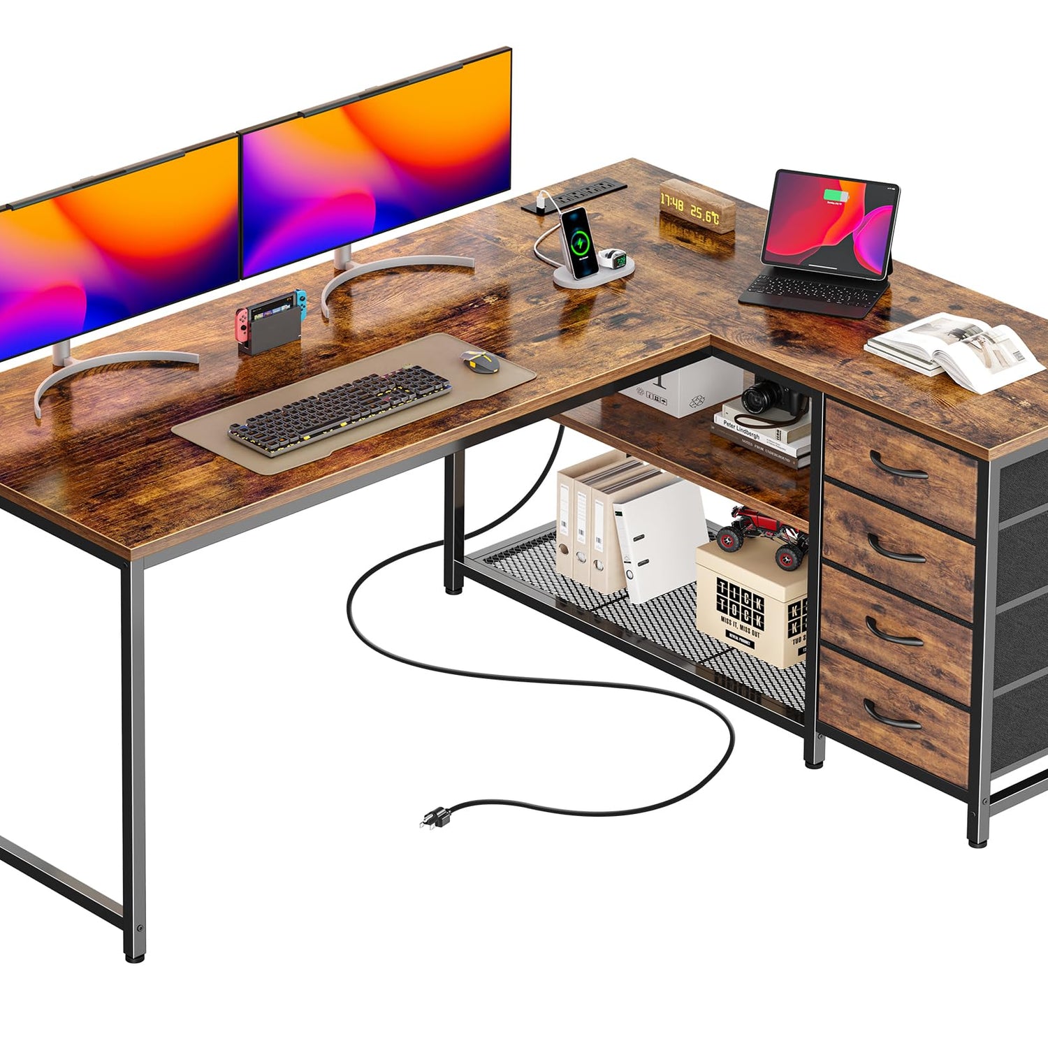 - 【Oversized Desktop & 4-Drawer Storage】Working in a small room? This l shaped office desk offers a wide surface. Main desk fits dual monitors, keyboards, or gaming setups. Side desk holds your printer, notebooks, or a second laptop. 4 fabric drawers and 2 open shelves (adjustable wood & mesh shelf) of the corner gaming desk give you the storage flexibility you need or remove shelves entirely for tower PC space