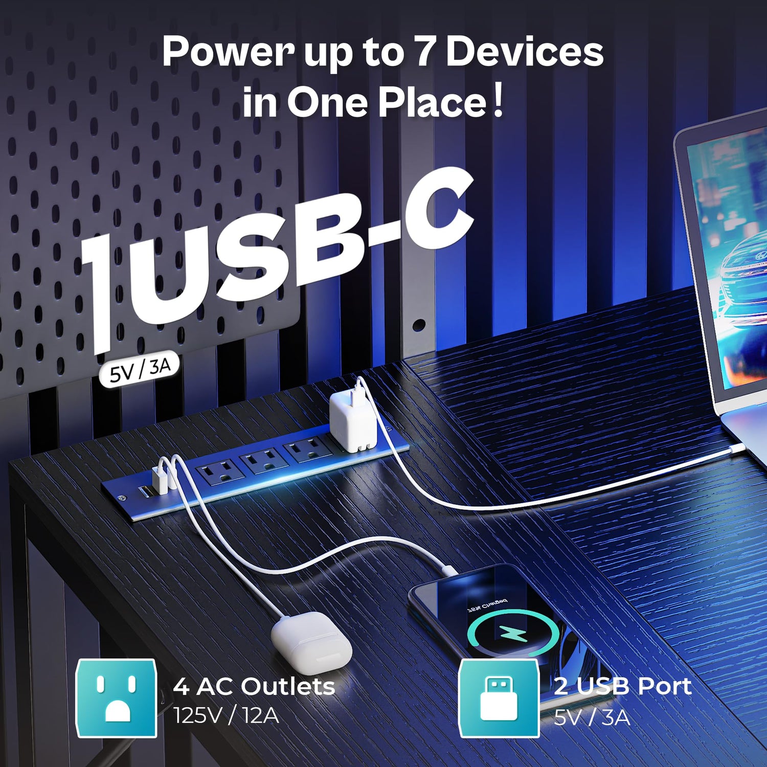 - 【Power Up Your Gaming or Working】Built-in power strip with 4 AC outlets, 2 USB ports, and 1 USB-C port keeps your laptop, monitor, and phone charged without crawling under the l shape gaming desk. Whether you're grinding through work or deep in a game, everything stays powered with this gaming desk with storage — right at your fingertips