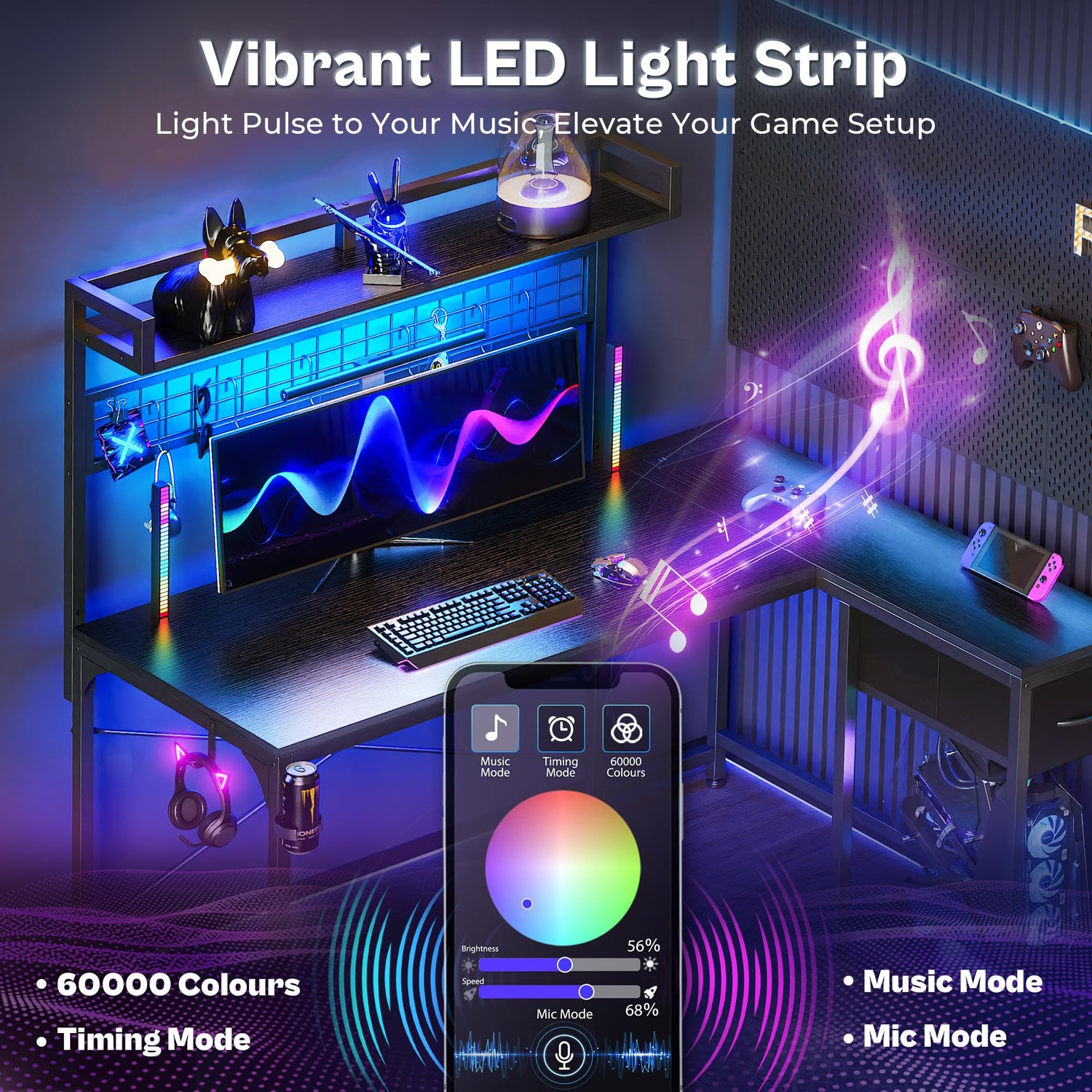 - 【RGB LED Lights That Match Your Mood】Create your perfect vibe with dynamic LED lighting on the corner computer desk — control it with a smart controller or app, and choose from 6,000+ color options. Set it to pulse with your music, glow softly as a nightlight, or change with your mood. This 50 inch gamer desk is great for game nights, chill evenings, or content creation