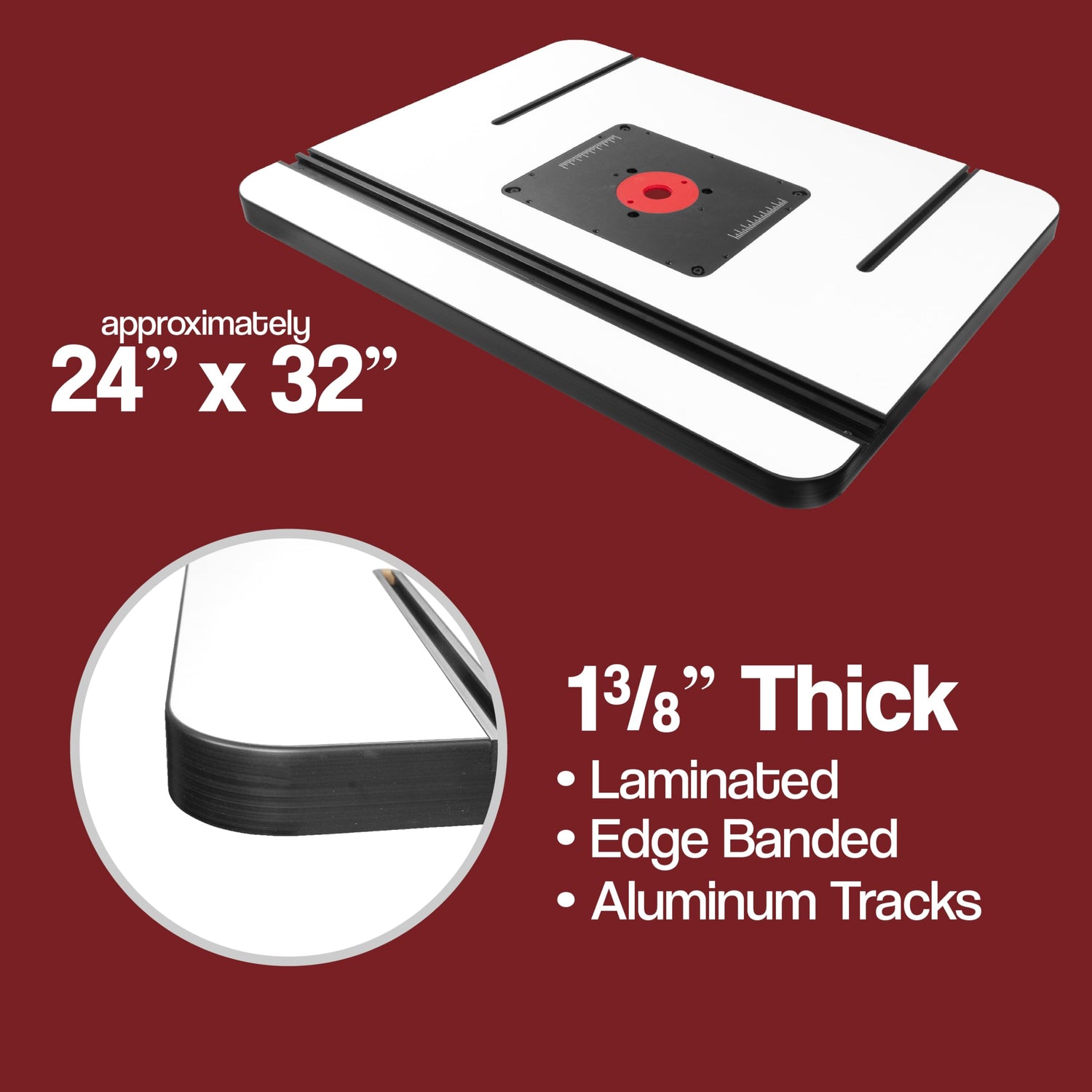 - Featuring an industry leading 1-3/8” thick MDF router table that is laminated on both the top and bottom. This helps prevent excessive moisture infiltration and unwanted warping. This extra thick table top also absorbs vibration and doesn’t chatter like standard, thinner router table tops tend to. The bright white laminate table top surface provides you with excellent stock visibility and is perfect for smoothly feeding your stock through the cutter.