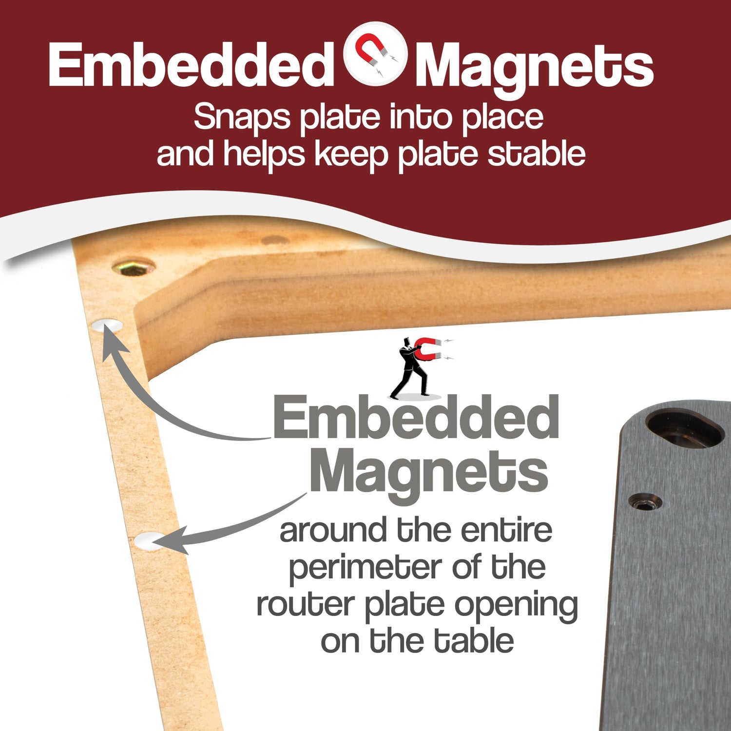 - A premium 9 ¼” x 11 ¾” phenolic router plate is included and features 5 easy to install insert locking rings, a locking ring wrench, hold down screws, leveling screws and the plate is etched on the bottom with guide marks for aligning most any brand of router. The table top opening has magnets embedded around the perimeter to snap the router plate in place. The magnets align with the router plate set screws. Router mounting instructions are included