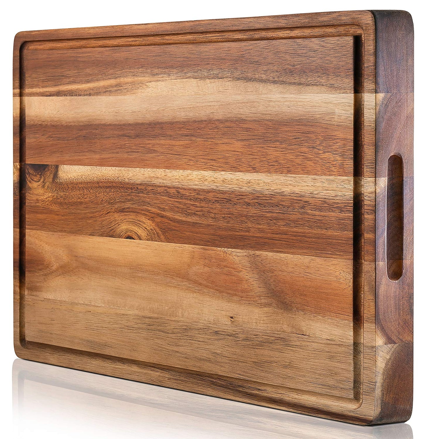 - ✅ Bigger Is Better – Our Acacia wood cutting board for meat has the recommendation and approval of professional chef Charlie Fadida, who knows size matters for wood cutting boards. Our kitchen board and chop board is superior to the competition, so compare before you buy: at 17" x 13" x 1.4" and 7 lbs. weight, our extra large Acacia cutting board is larger, thicker, and more versatile. Our thick and heavy acacia chopping board is ideal for frequent use, including as a serving tray.