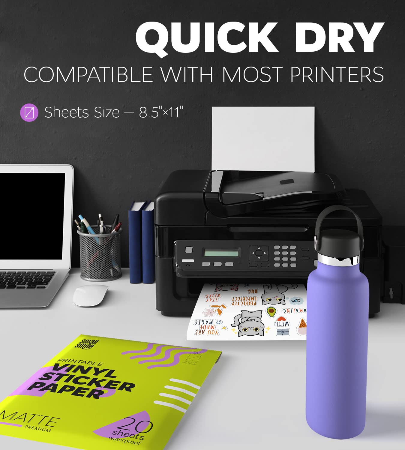 Premium Printable Vinyl Sticker Paper for Inkjet Printer and Laser - 20 White Matte Sticker Paper Waterproof - Durability Adhesive Paper 8.5 x 11, Fast Dry, Holds Ink Well, Great for Cutting Machines