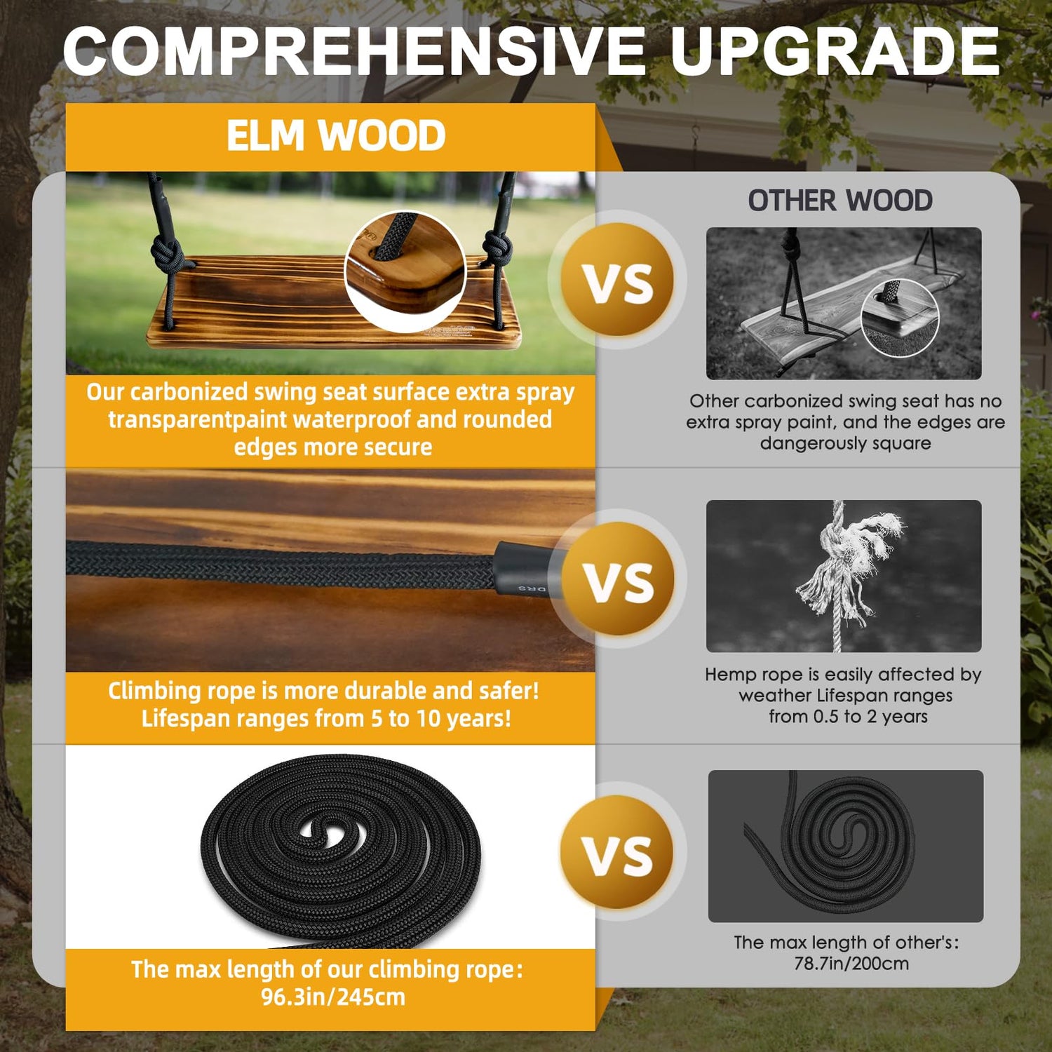 - đ»ăHIGH QUALITY SWINGăSwing Seat are made of 100% elm wood, natural non-toxic, strong and durable. The surface of the swing is polished with lacquer to bring comfortable feel without burrs, 100% waterproof and smooth. The rounded corner design of the wooden swing seat replaces the traditional square corner to prevent bruising and make it safer. High-quality materials allow the tree swing to withstand long stretches of outdoor sun, wind and even snow while maintaining its luster.