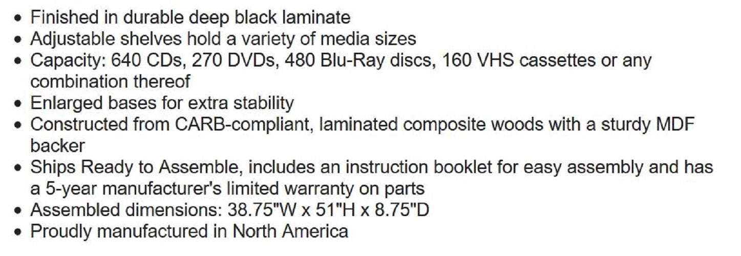 Details: The Double Width Wall Storage offers an exceptional solution for your media storage needs, blending style, functionality, and a sleek black finish. Designed to accommodate various media formats, its compact dimensions of 8.75” D x 38.75” W x 51” H allow it to fit seamlessly into any living room, home office, or entertainment area while providing ample storage space. Featuring fully adjustable shelves separated by a central divider, this unit allows you to customize your storage to suit your collection’s unique requirements. Whether you’re a movie buff or a music enthusiast, this piece simplifies sorting and accessing your media with its convenient horizontal design. Constructed from durable, non-toxic, CARB-2 compliant laminated composite woods, this media storage cabinet is built to last while maintaining a sophisticated appearance. With its substantial capacity, this multimedia storage unit is perfect for collectors who value organization and style. The central divider provides structural stability and helps maintain order within the unit, while the adjustable shelves let you easily store and rearrange your items as your collection grows. This system offers an efficient alternative to traditional DVD storage cabinets, CD cabinets, and bulky multimedia cabinets, ensuring your space remains clutter-free and visually appealing. Proudly made in USA & Canada, this unit comes with a 5-year limited warranty, guaranteeing exceptional quality and peace of mind. Whether you’re looking for a practical CD storage solution or a stylish addition to enhance your décor, this piece offers the perfect blend of functionality and elegance. Its clean lines and minimalist design ensure it enhances any room’s aesthetic while keeping your media collection organized and easily accessible. Elevate your storage game and keep your favorite titles at your fingertips with this durable and stylish media storage unit, the perfect choice for modern homes and entertainment enthusiasts alike.