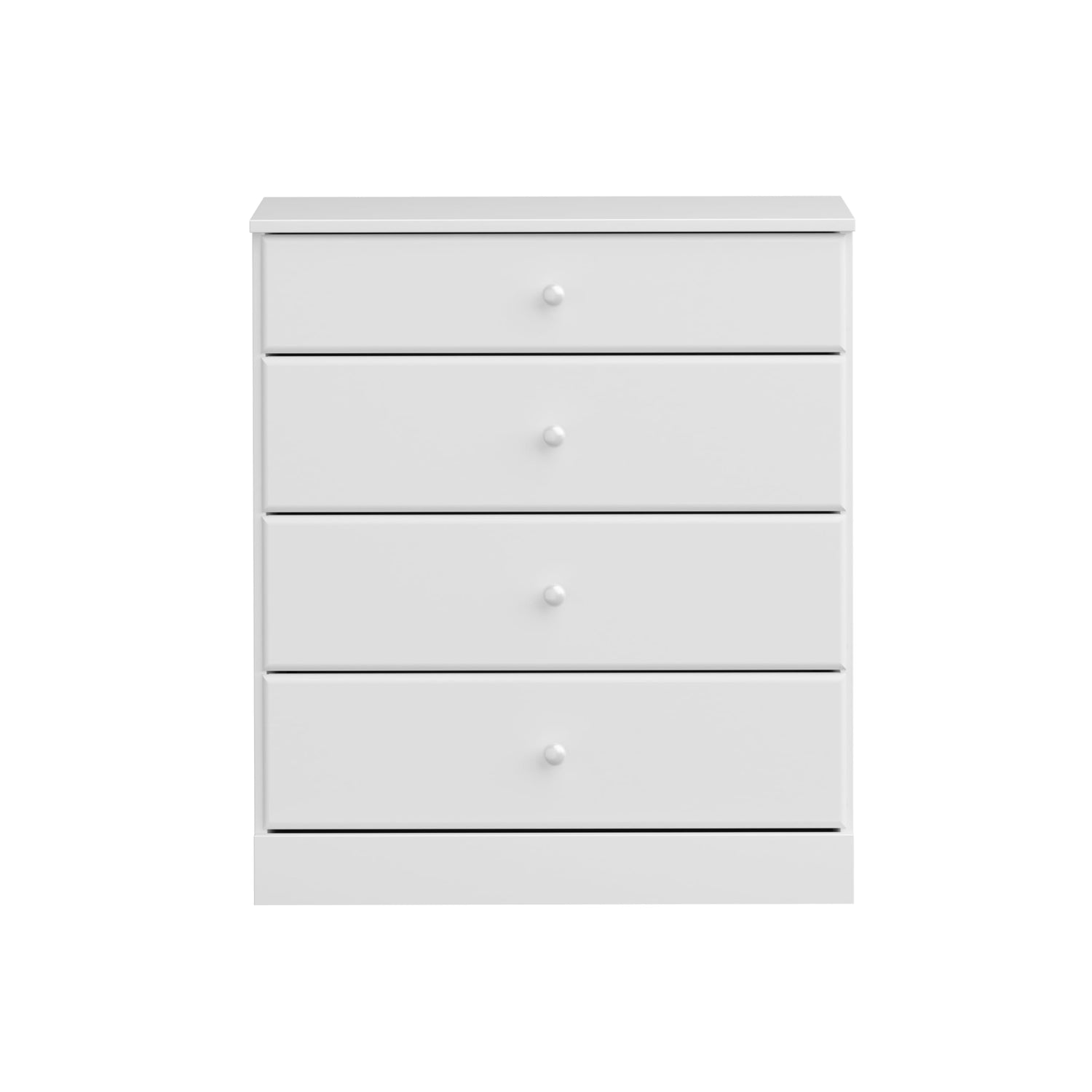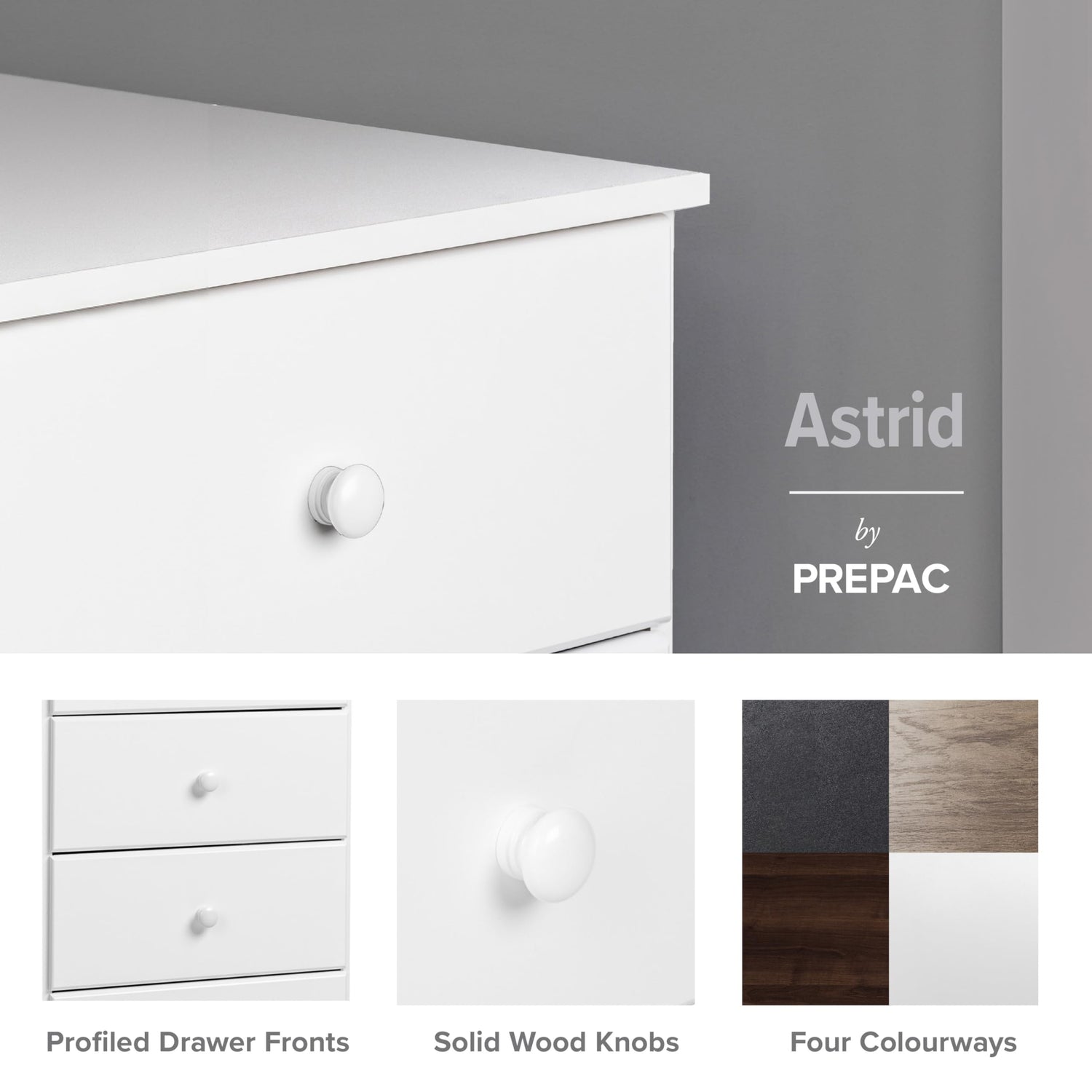 Details: Add a classic, simple, storage solution to your bedroom with the Prepac Astrid 4-Drawer Chest. It's contemporary design and clean lines will complement any decor. Profiled drawer fronts and solid wood knobs help provide a timeless look. Use on its own or pair it with other matching pieces from the Astrid Collection. Constructed from non-toxic, CARB-2 compliant, laminated composite woods with a sturdy MDF backer. Ships Ready to Assemble, includes an instruction booklet for easy assembly.
