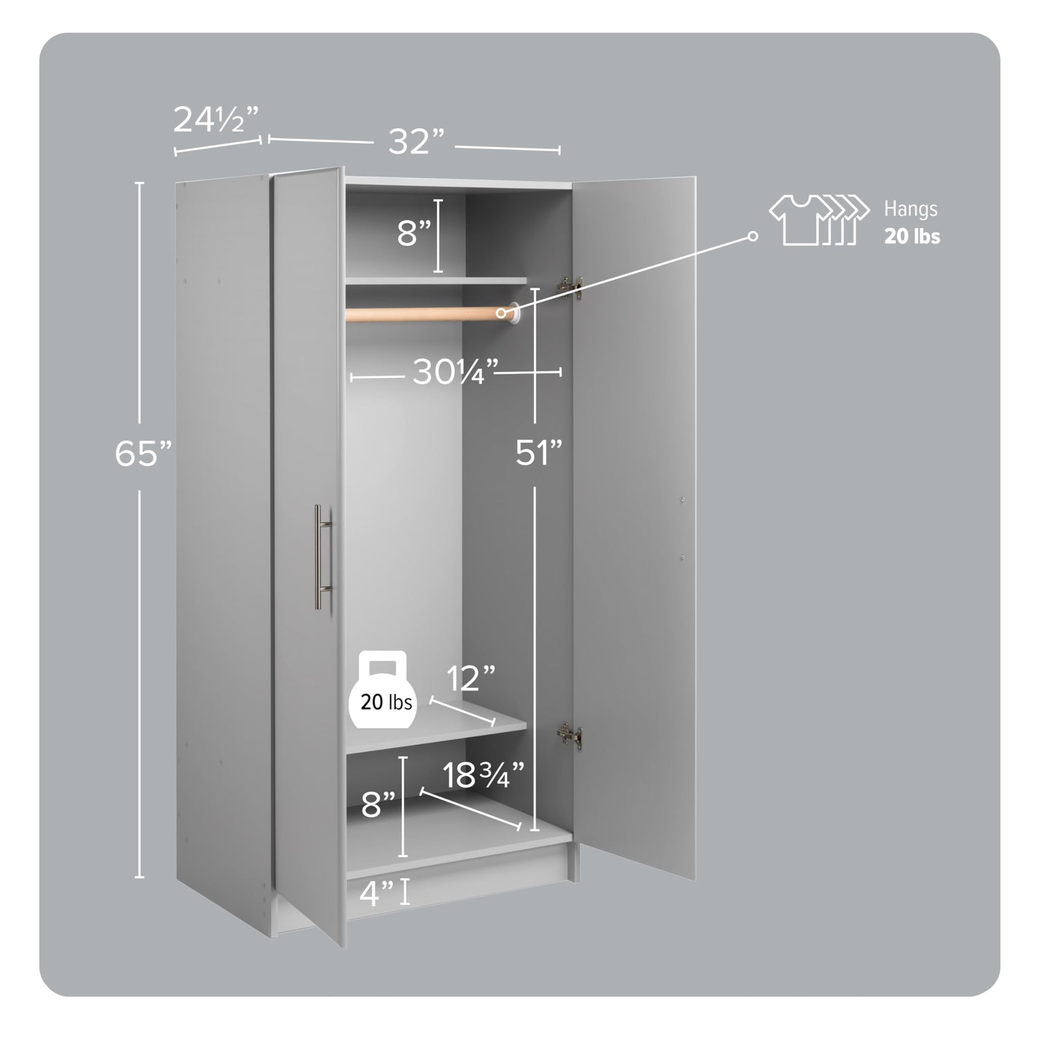 Details: Master the art of home organization with the Prepac Elite 2 Door Wardrobe Cabinet. This freestanding storage solution features two sophisticated soft-edge doors on European style six-way adjustable hinges, a hanging rail, and two fixed shelves to accommodate flexible clothing organization needs. Adorned with a deep white laminate finish and two satin nickel-finished metal pull handles, this closet storage rack cabinet will provide convenient and seamless storage anywhere in your home. The 20-inch depth provides ample space to accommodate hangers along the integrated rail, offering a reliable space for jackets and other articles of clothing. Stash your small accessories on either the bottom or top fixed shelf to create an organizational layout. This wardrobe cabinet makes for a convenient extension of your closet system in the bedroom, or as a coat hutch in your entryway. This durable wardrobe ships flat packed and ready to be assembled upon delivery with an included instructional booklet. This organizer shelf is made with non-toxic, CARB-2 compliant laminated composite woods for durability. Measuring 20"D x 32"W x 65"H with internal measurements of 18.75" D x 30.25" W x 59" H, this storage organizer will effectively house and protect many articles of clothing.