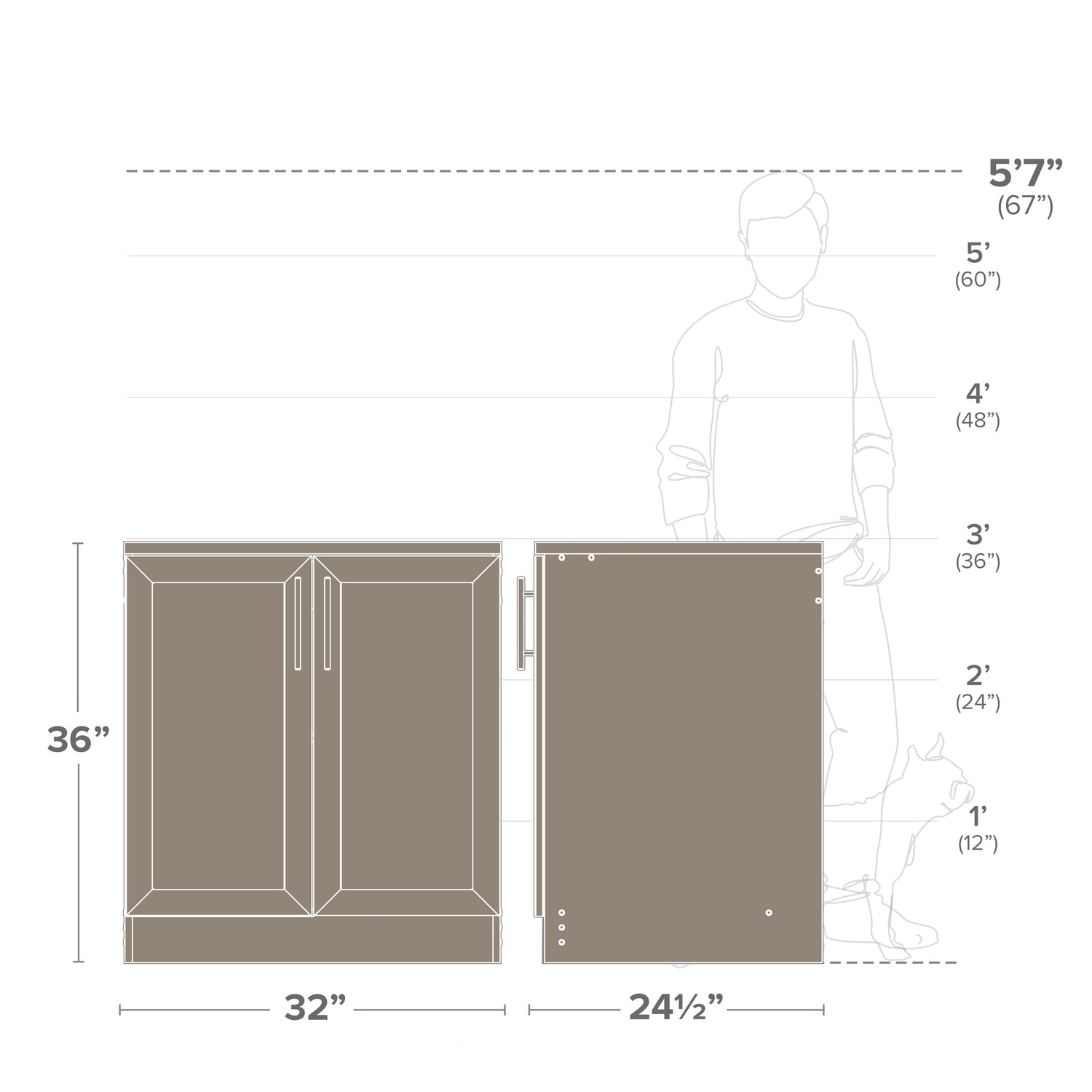 - ASSEMBLED DIMENSIONS & WEIGHT: Cabinet- 24.5" D x 32" W x 36" H, Total weight- 92 lbs., All pieces arrive ready to assemble in 1 Box
