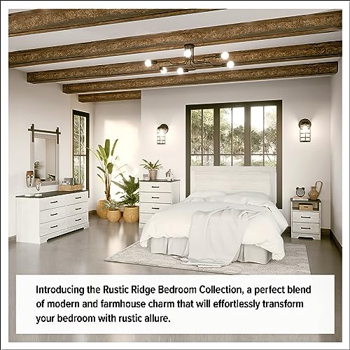 Details: Amplify your bedroom with the functionality and modern style of the Prepac Rustic Ridge Farmhouse Nightstand. This stylish bedside table with real wood pine drawer sides features an open cubby and two drawers and fits neatly beside your bed or sofa to offer a convenient and stylish way to keep your essentials close by during bedtime or nap time. Boasting a two-tone, whitewash finish with semi-matte black pulls and a rustic gray planked oak grain top, this bedroom nightstand complements any bedroom or living room with its rustic charm and touch of industrial style. The open cubby provides ample display space or can hold a storage bin for convenient bedside organization, and the two smooth-gliding drawers extend far out for easy access to the contents inside while maintaining safety. Constructed from durable engineered wood with a sturdy MDF backer and decorative laminate finish, this high-quality industrial nightstand withstands years of reliable bedroom organization. The bedside nightstand measures 16.25in x 18.75in x 24.5in when assembled for the perfect fit beside any bed, sofa, desk, or small space that could use a delightfully homespun charm.