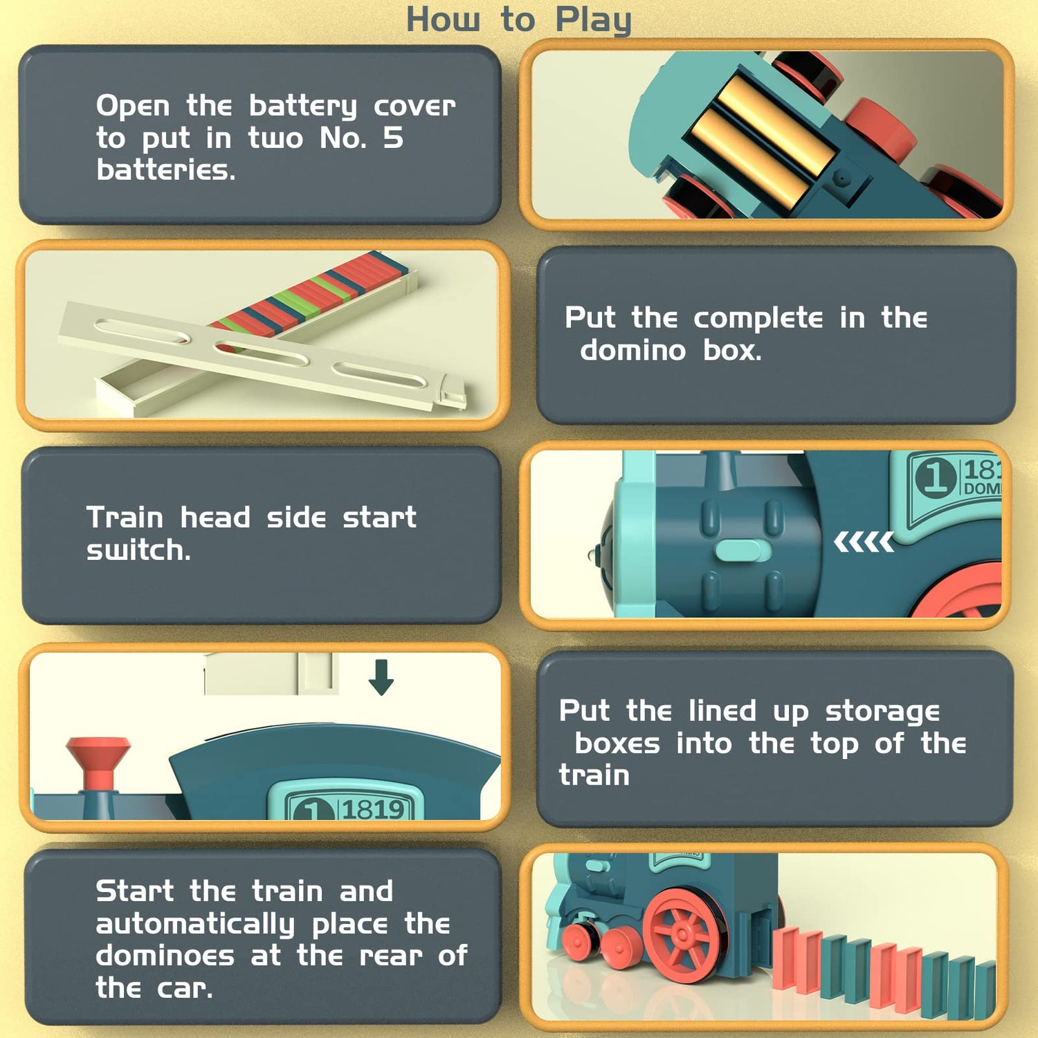 - Let's play domino: As the first domino rally for toddler, it's a very creative and fun toy to play domino that automatically stacking dominoes. Putting dominos into the trains slot and with a press of button, you're off! The electronic locomotive has a light that blinks, and has some cool train sounds when it moves. By turning the train converter in the direction you want the dominoes to be placed, it allows your child to easily set and push the dominoes down with minimal effort.