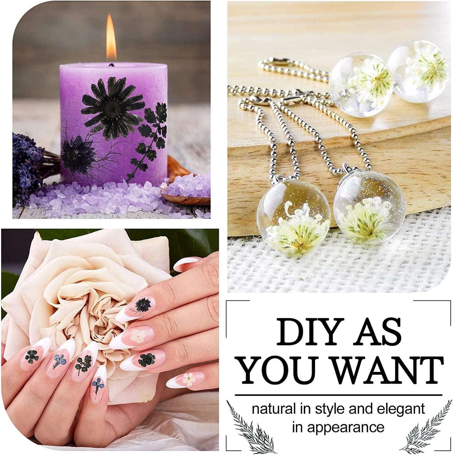 - Different usages: natural pressed flowers for resin can be widely applied for nail, resin molds, DIY jewelry design, resin phone case, note card, stationery, wedding invitations, envelopes, stained glass, bookmarks, candle makers, soap making, table decorations, scrapbooking, furniture and wood workings