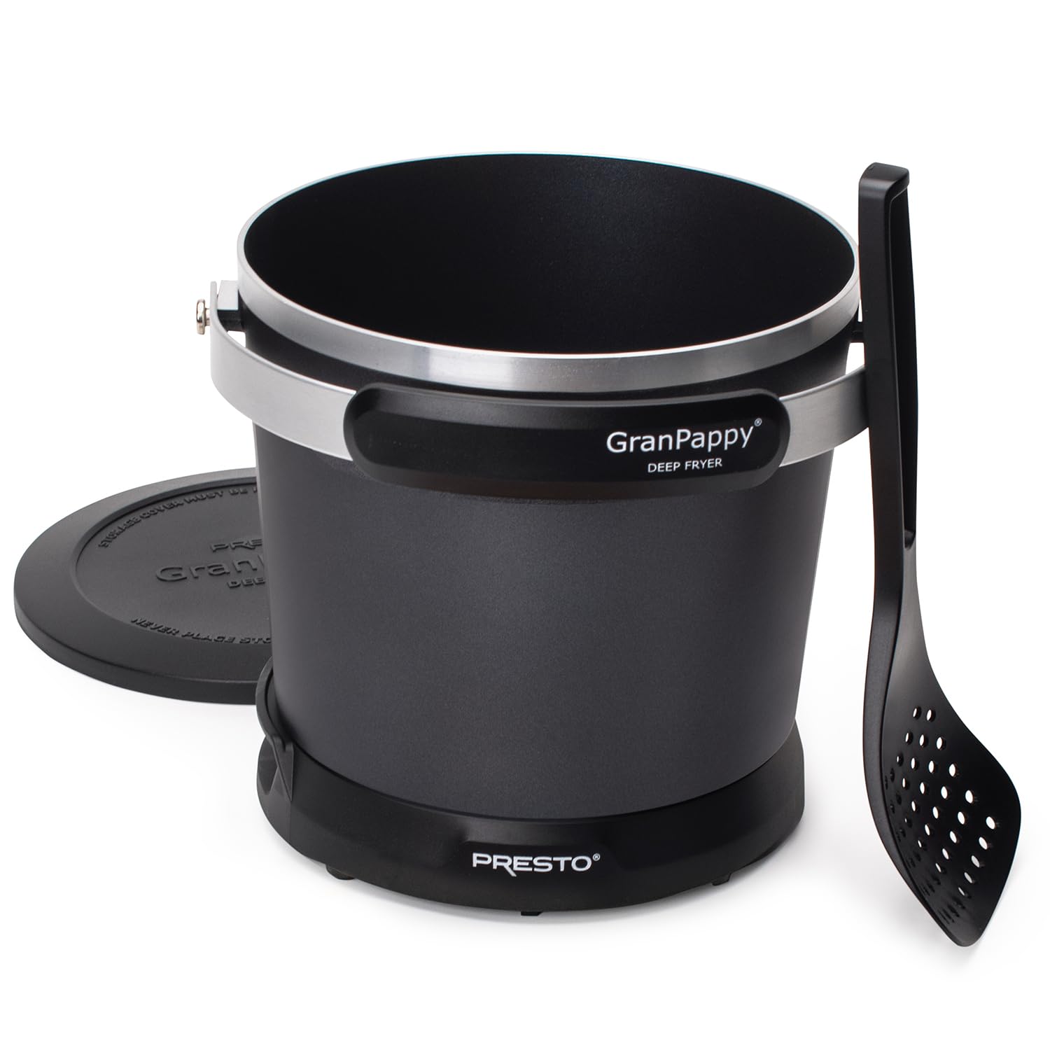 In the homespun days, food was usually fried in a big cast-iron metal pot. But modern times demand simpler solutions. The Presto GranPappy electric deep fryer fits on a countertop and is so easy to use. Just add oil, plug it in, and in 15 minutes it's heated up and ready to fry. Its sleek, black bucket shape matches form to function-- simple and classic.