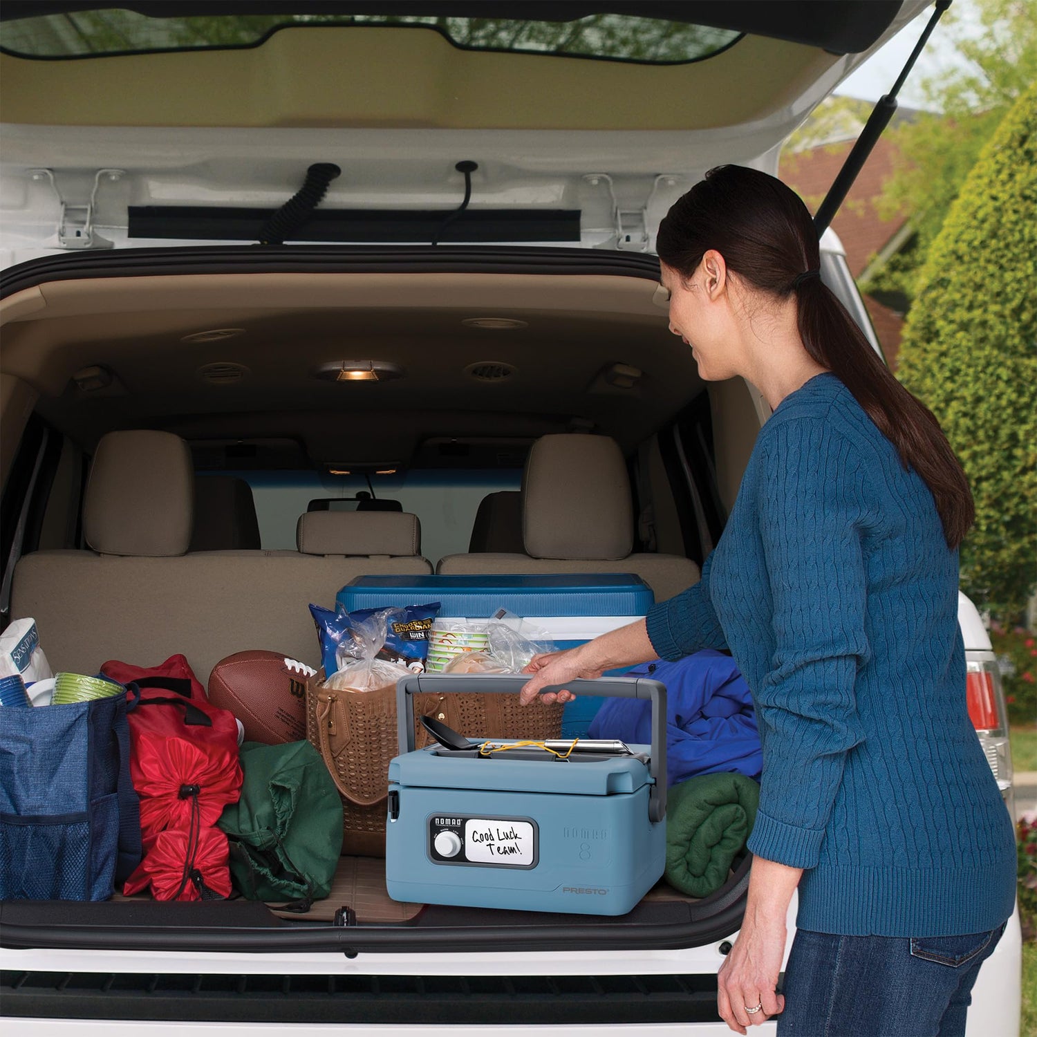 Details: Slow cook foods and take them on the road with confidence in the Presto® Nomad® traveling slow cooker. Styled with contemporary blue cool-touch housing, this rugged 8-quart slow cooker is ideal for big batches of pulled pork, chicken wings, sloppy joes, hot beef, soups, stews, and casseroles at home or away. Identify the food or write a clever message with the dry erase marker and board. When on the go, the swing-up handle with seal-tight gasket locks the lid making it easy to carry, and the wide-profile design with built-in cord storage helps to prevent tip-overs. The detachable utensil holder secures a utensil for transit and then doubles as a spoon rest for serving. Cleanup is easy too, both the PFAS-free porcelain enameled pot and hinged cover are removable.