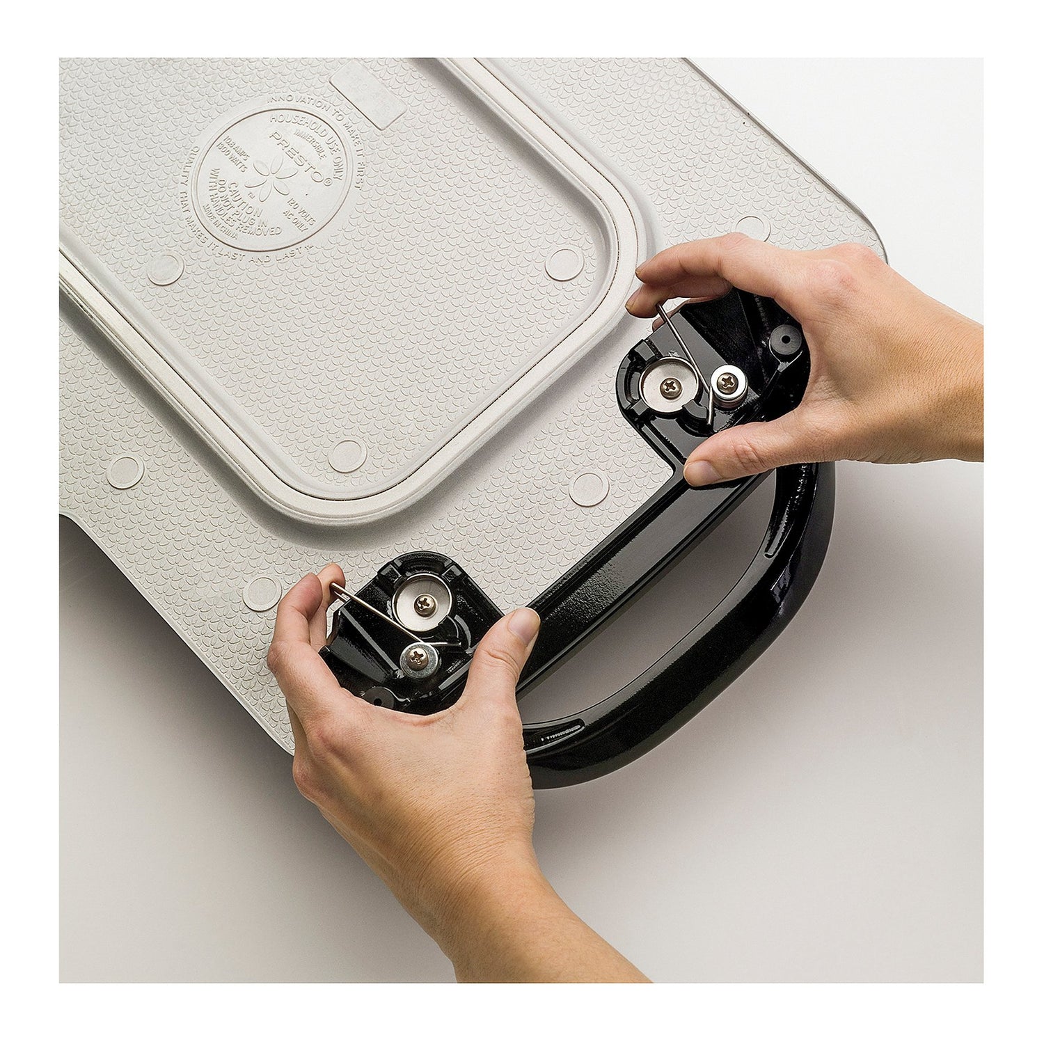 Details: This extra-large griddle cooks enough food for the entire family and features detachable handles for compact storage. Simply open the latch clips to release handles from base. With handles removed, the base stores neatly in most standard 18-inch kitchen cabinets. Premium textured cooking surface provides enhanced nonstick performance for stick-free cooking and easier cleaning. Control Master* heat control automatically maintains the desired cooking temperature. Heavy cast aluminum base is virtually warp-proof. Slide-out drip tray removes and cleans easily. Griddle is fully immersible with the heat control removed. 120 volts AC, 60 Hz only, 1500 watts