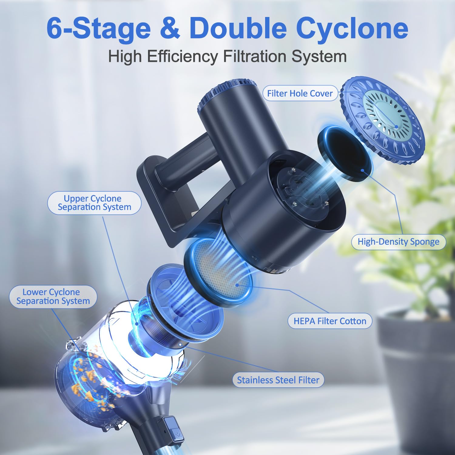 • 【6-LAYER DEEP FILTRATION】: The vacuum for hardwood floors's groundbreaking six-stage dual cyclone filtration system ensures that 99.98% of tiny dust particles are filtered out, as small as 0.1 micrometers. The battery vacuum cleaner cordless's upgraded dual cyclone filter provides powerful suction and trash compression, ensuring no dust can escape from the hardwood floor vacuum cleaner.