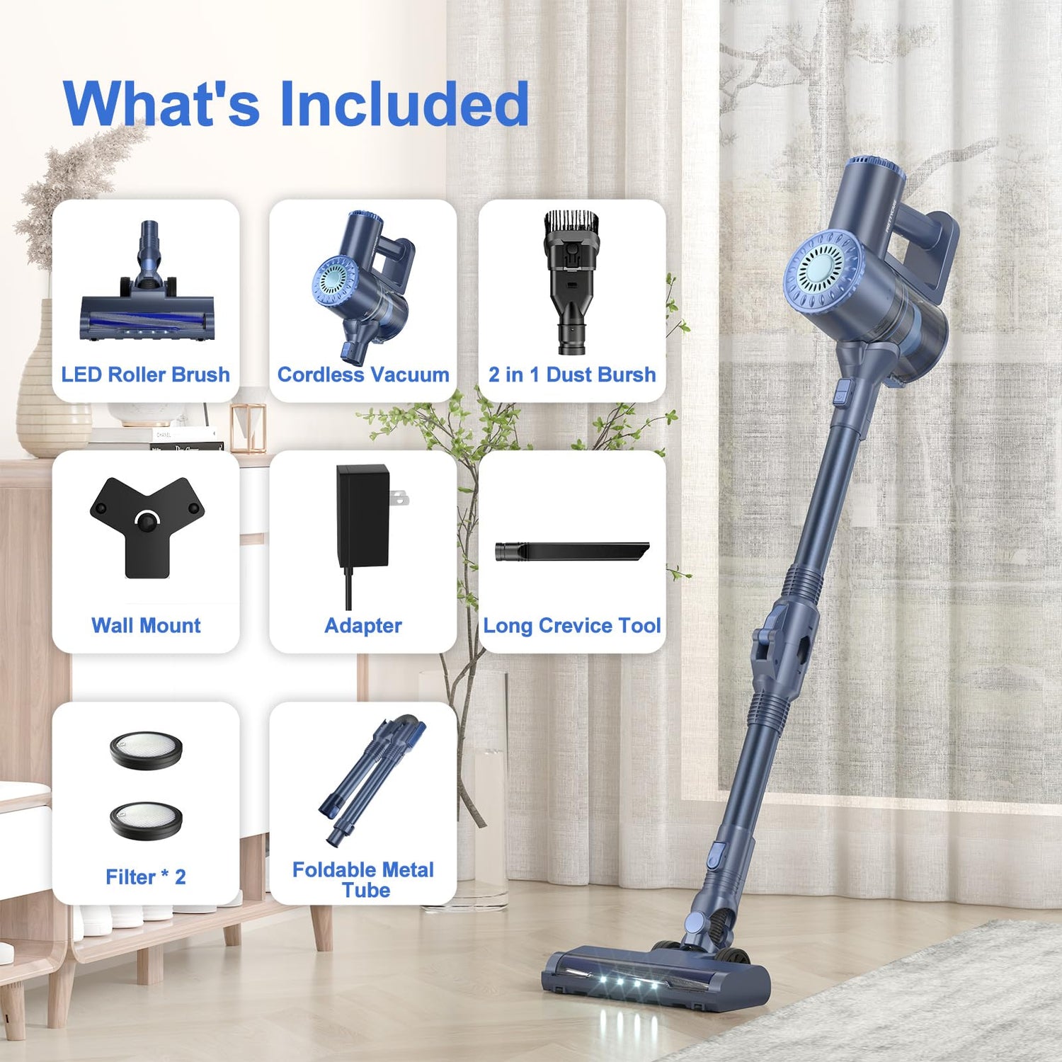 • 【6-IN-1 DESIGN】The stick vacuums comes with a 6-in-1 accessory combination, including a floor brush head, a 2-in-1 brush head, a long crevice tool, among various other parts. By adjusting the combinations of brush heads and the folding pole, vacuum stick is able to deeply clean curtains, beds, floors, carpets, and any hard-to-reach corners.