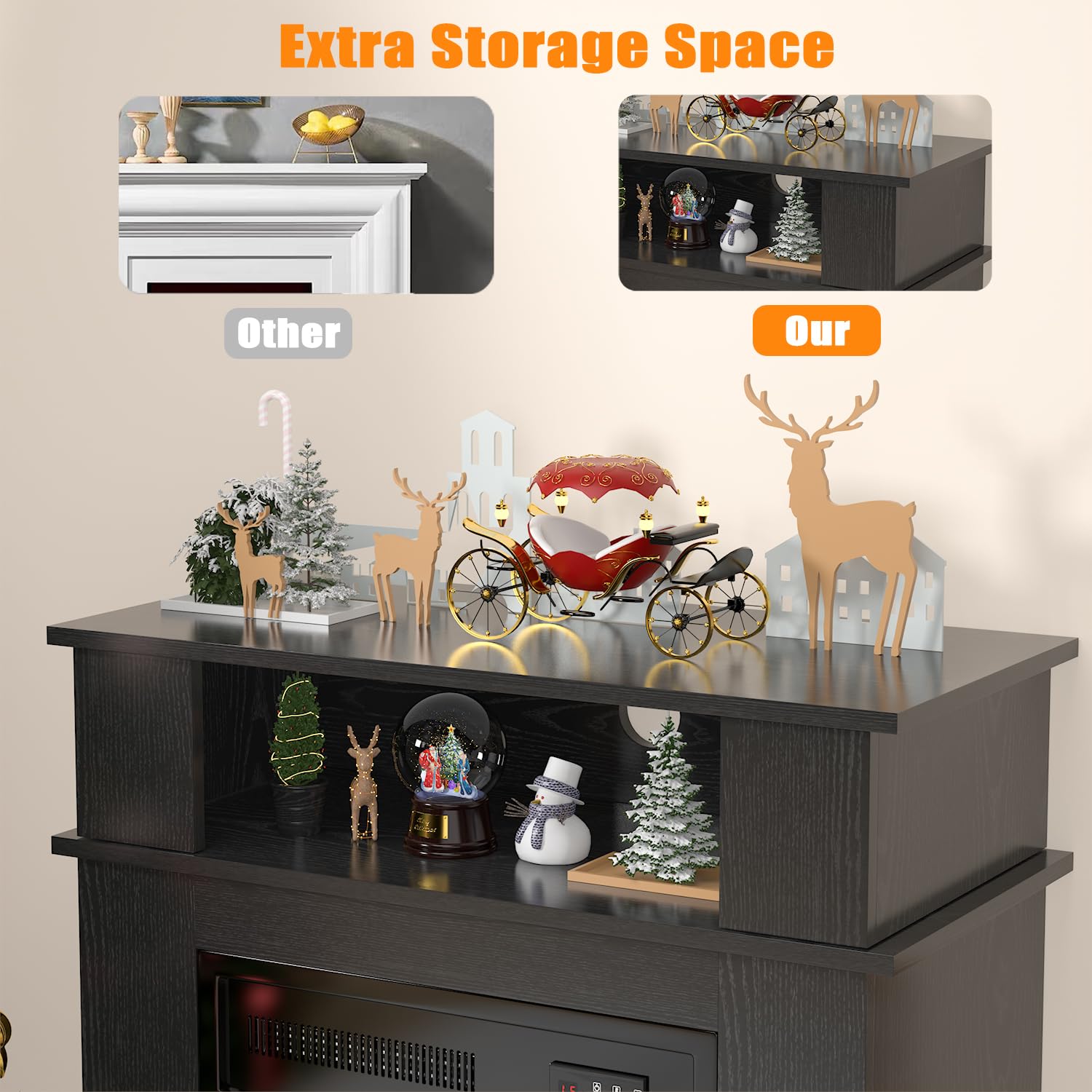 - Extra Multifunctional Storage Space: The fireplace mantel features an electric fireplace and a wooden storage cabinet, adding elegance to any room. Tabletop and open storage shelves keep books, CDS, small plants, decorative items and more organized. This mantel is both practical and decorative. Perfect for improving the quality of your interior space!