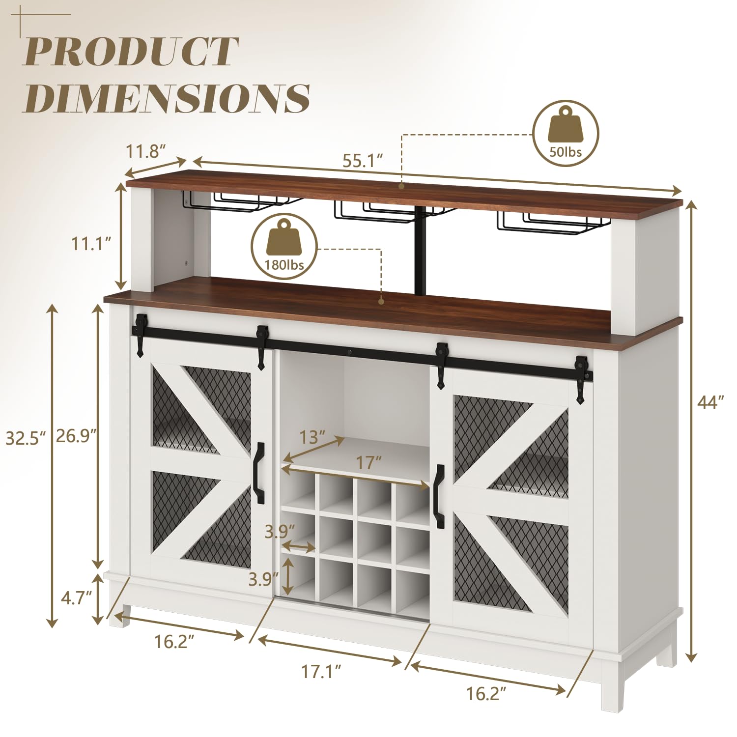 PRETZI 55" Farmhouse Coffee Bar Cabinet with LED Lights, Wine Bar Cabinet with 4 Tier Storage, Kitchen Buffet Cabinet with Sliding Door & Wine and Glass Rack for Dining Living Room