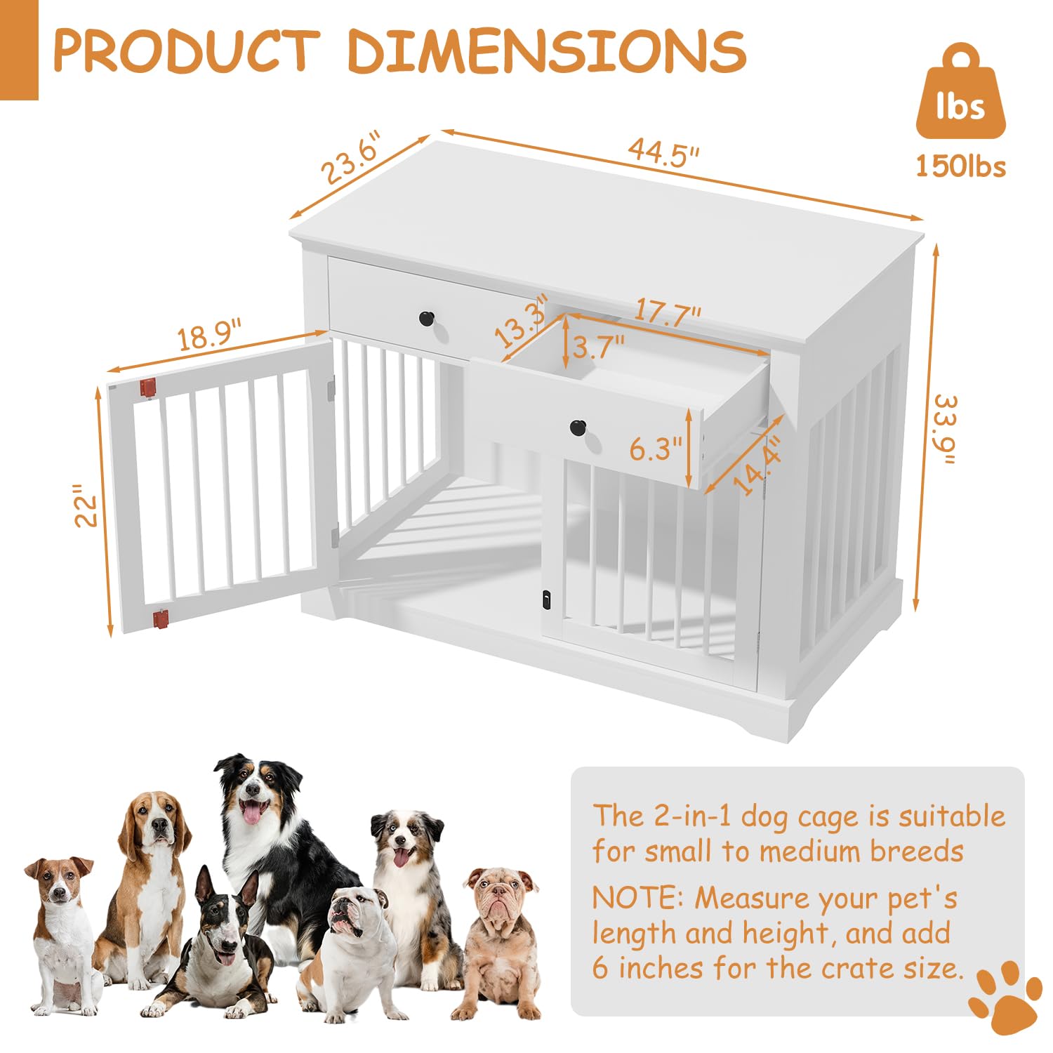 - Multi-Purpose Dog Cage: Whole Size: 44.5"L x 23.6"W x 34.5"H. This large dog crate furniture is elegant and practical for small to large dogs, also functioning as a side/coffee/bedside table with space for pet items