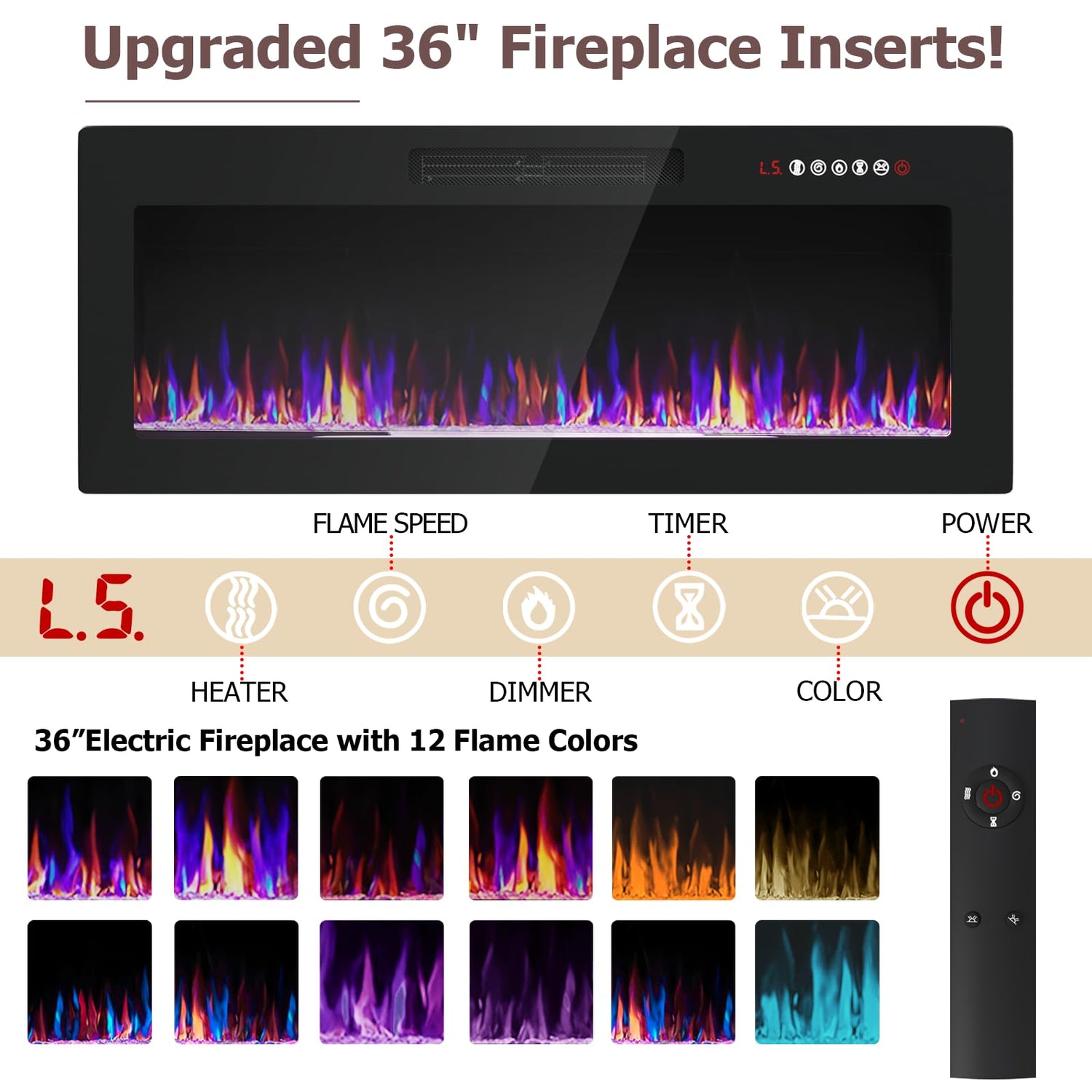 - 【CUSTOMIZE THE AMBIANCE】:The electric fireplace has adjustable features,with 5 brightness levels, 12 flame colors and 16-color LED lights, you can also set an 8-H timer for it,and when it's running,the noise is less than 40 dbs,so you can create a cozy and quiet atmosphere. Keep in mind that it doesn't pump out a ton of heat, so it's not gonna replace your regular winter heater.