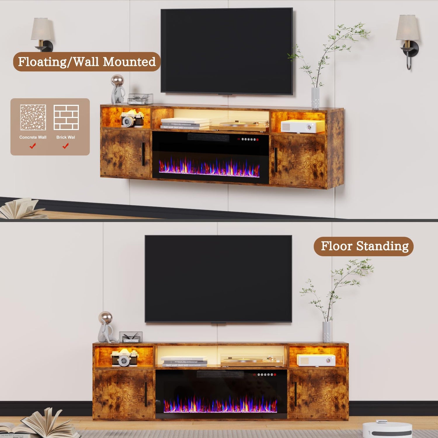 - 【Unique Floating 2-In-1 Design】: This fireplace TV stand combines a 70-inch floating TV cabinet with a 36-inch electric fireplace. The floating design saves valuable floor space and makes the room appear more spacious. The elevated structure allows for effortless cleaning, preventing dust and debris buildup. The height of the cabinet hanging on the wall can be adjusted at will.