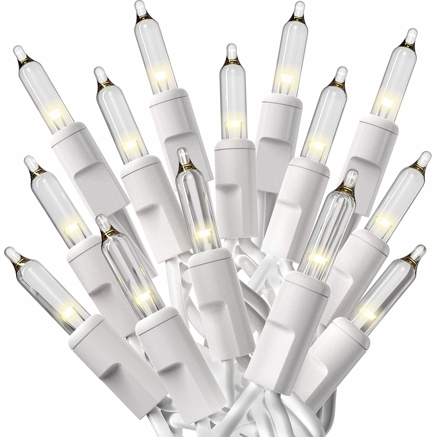- Light Set Details: This incandescent mini clear warm white 100 count string Christmas lights set includes 20 ft of lights on white wire; also features 2 flasher bulbs, 2 extra bulbs, and 2 replacement fuses