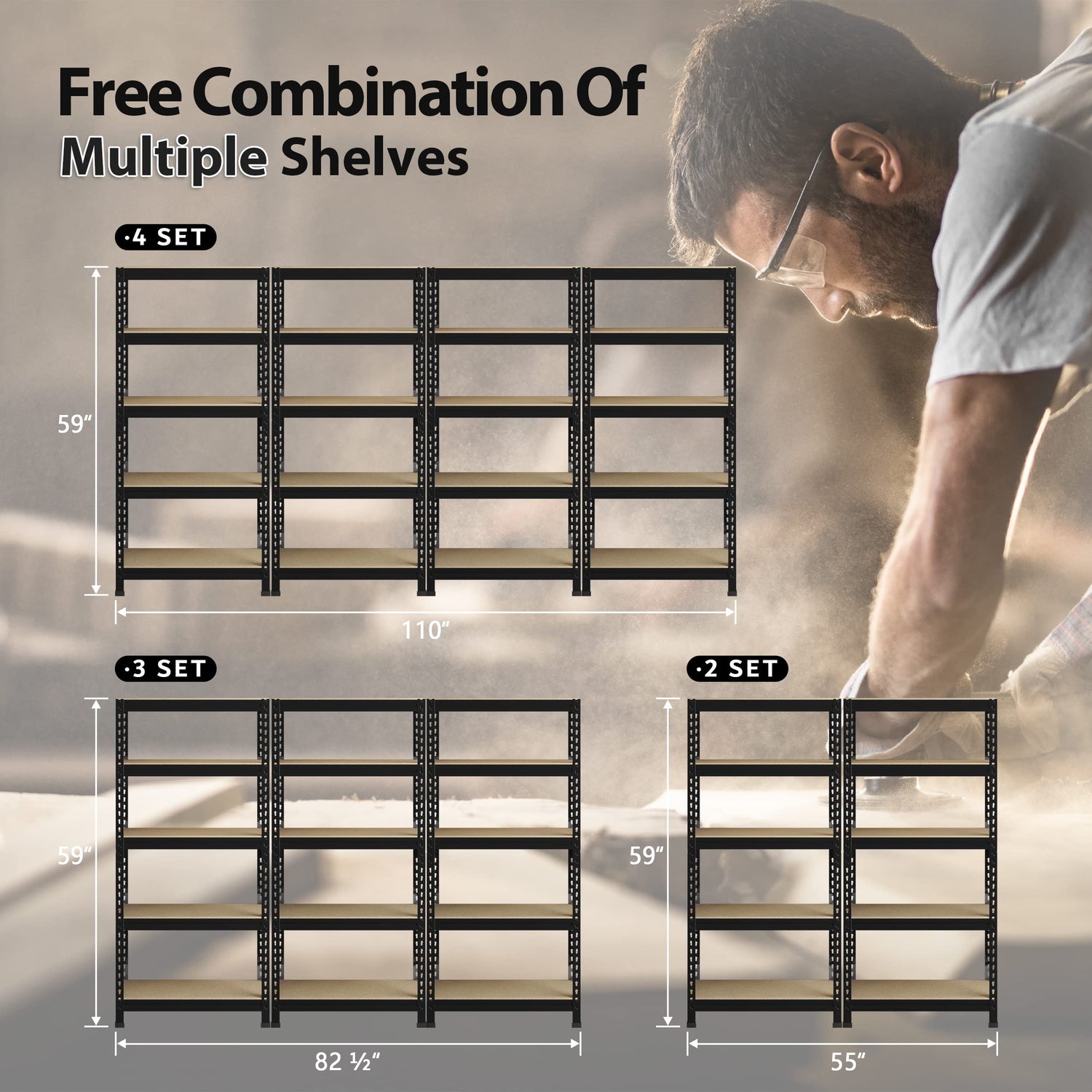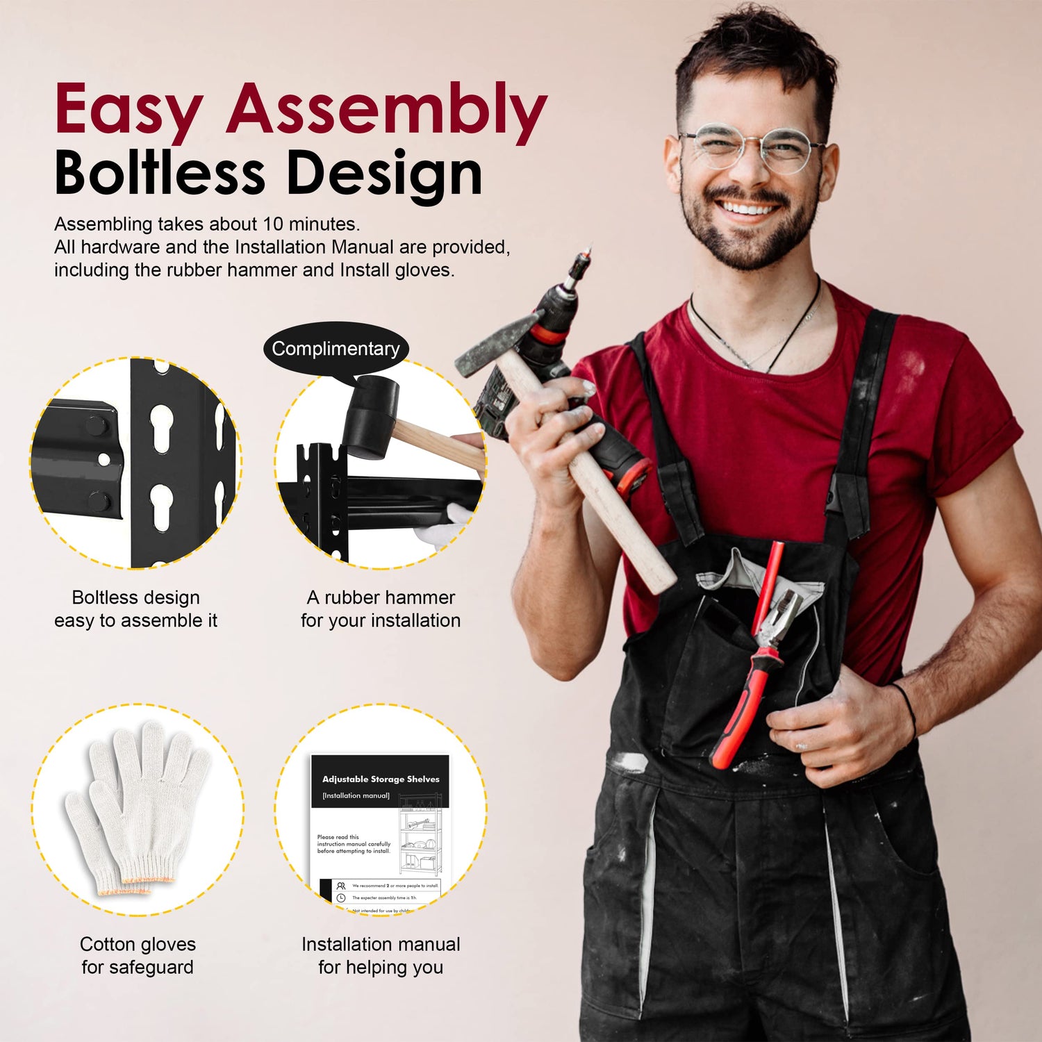 - 【 EASY TO ASSEMBLE 】 This 5-tier black storage shelves comes with a rivet lock design and includes a post coupler without needing any nuts or bolts. Easy installation with just the included rubber hammer, assembling takes approximately 10 minutes