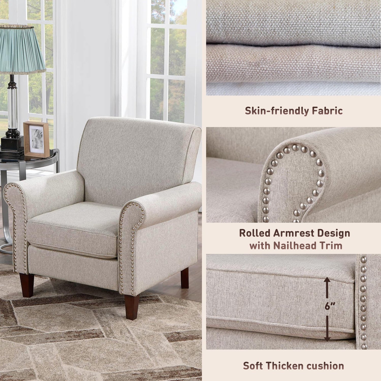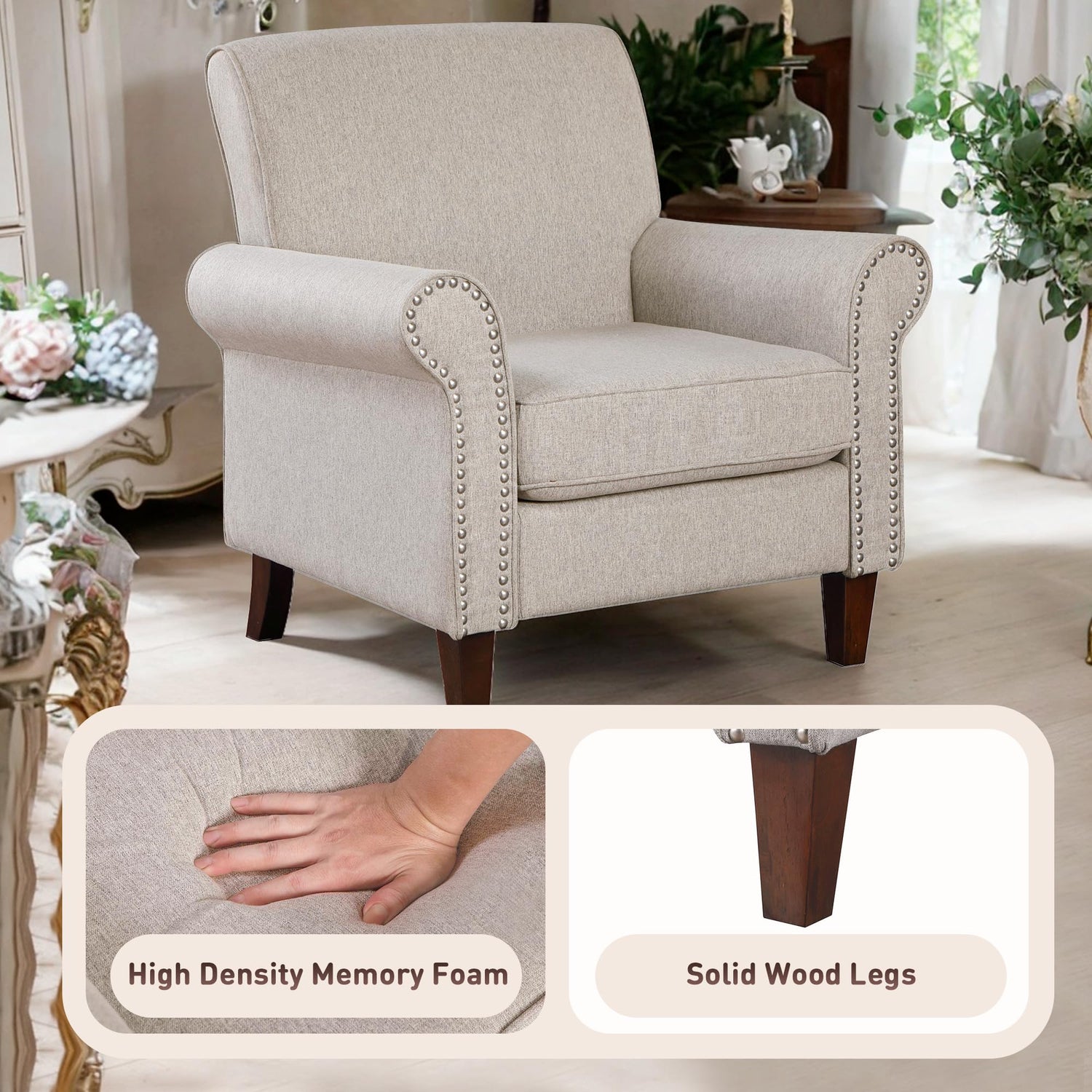 Prilinex Upholstered Living Room Chair - Large Comfy Fabric Accent Chair Single Sofa with Cushion, Rolled Armrest & Nailhead Trim, Mid Century Farmhouse Armchair for Bedroom, Office, Beige