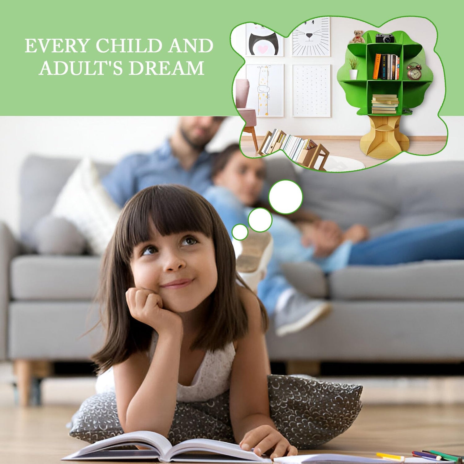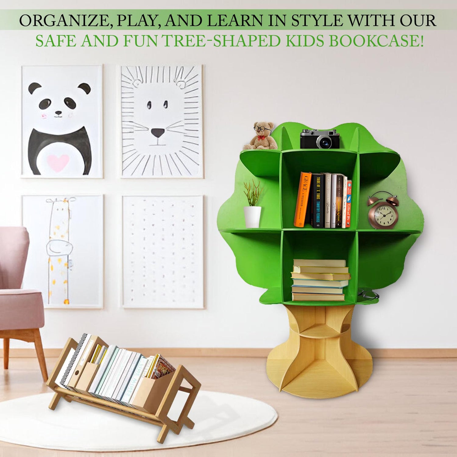 PrimeNex Tree Bookshelf, Floor Standing Tree Bookcase, Solid Wood Bookshelf for Kids Room, Classroom, Living Room, Home Office - Green