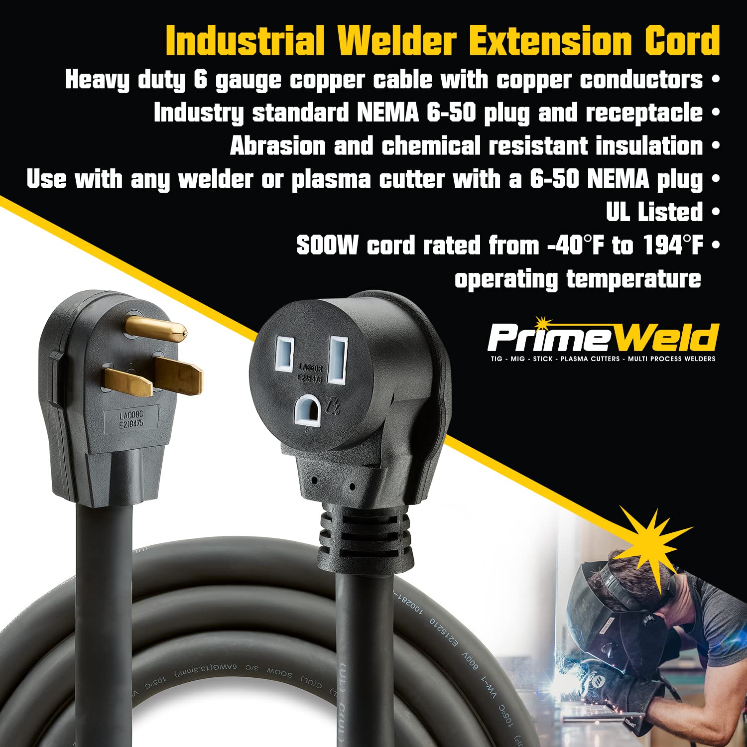 Details: The PrimeWeld Welding Extension Cord is what you need when you have to take your welder to the project. The 6 AWG, 3 conductor UL listed cord has an industry standard NEMA 6-50 Plug and Receptacle, which are what you need for 50 amp circuits. The copper is electrical grade so there’s only a minimal voltage drop to your machine. The cord has heavy insulation to protect the wiring from chemicals and it is abrasion resistant, so when you drag it around the shop over concrete and through mystery puddles, you know you’re still safe. Finally, an extension cord strong enough to use for welding and long enough to actually be useful. Whether you're a beginner or a professional, PrimeWeld makes some of the best equipment for all your welding needs. Don't sacrifice the quality of your work. Use what the pros use!