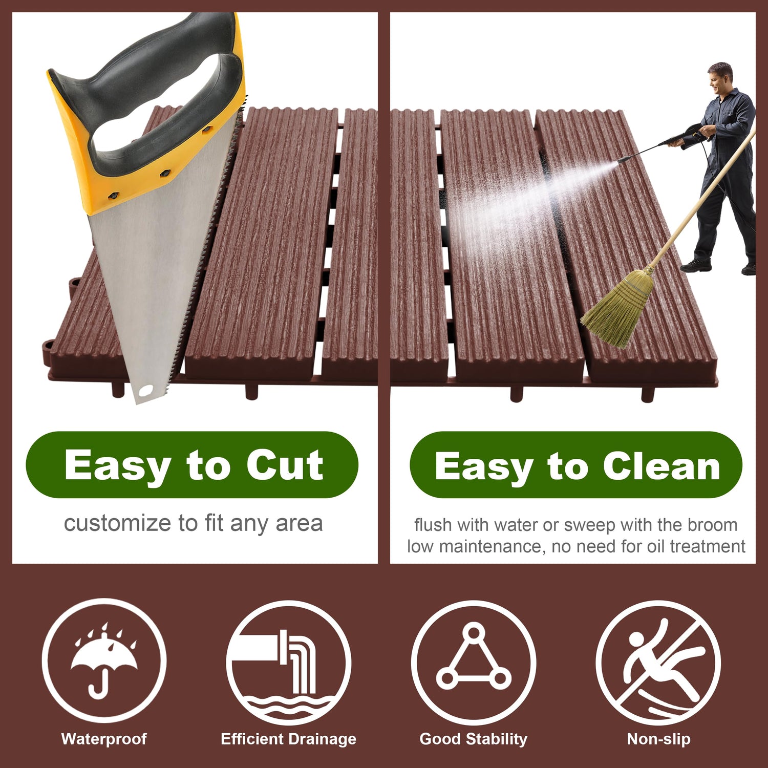 - 【Low Maintenance】The outdoor flooring tiles do not require oiling care, which makes them easier to clean and maintain. The plastic decking tiles consist of 5 slats with 4 drains to ensure water can quickly flow away from the deck surface, promoting air circulation and keeping it dry. Just sweep or hose it down and it will look brand new.