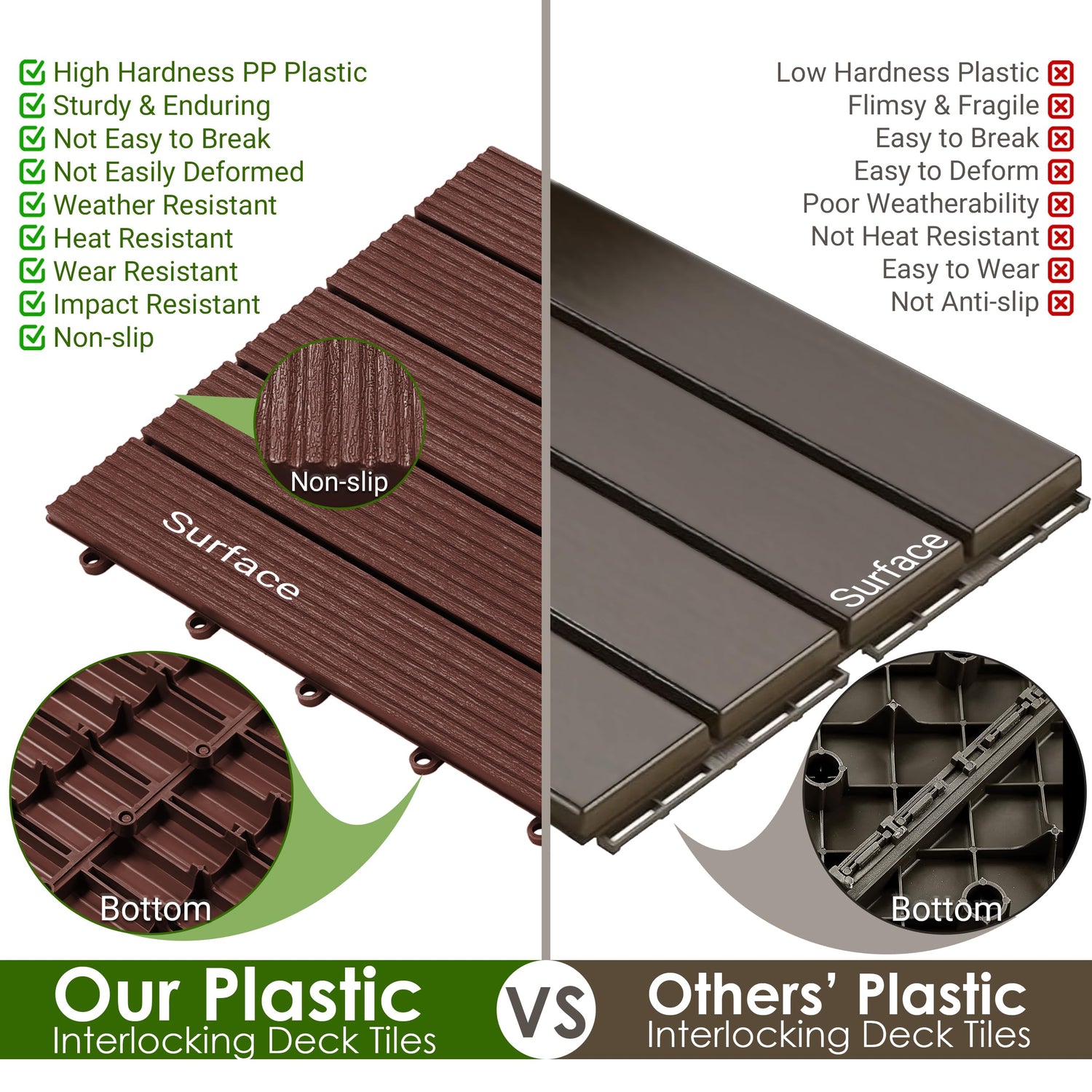 - 【Anti-Slip & Safe】The imitation wood grain texture on the surface of the interlocking floor tiles enhances the friction with your feet, and the grid structure on the bottom enhances friction with the ground, ensuring the deck tiles won't move easily and you won't skid or fall when walking on it. High-traffic areas can also be safely passed without barriers.