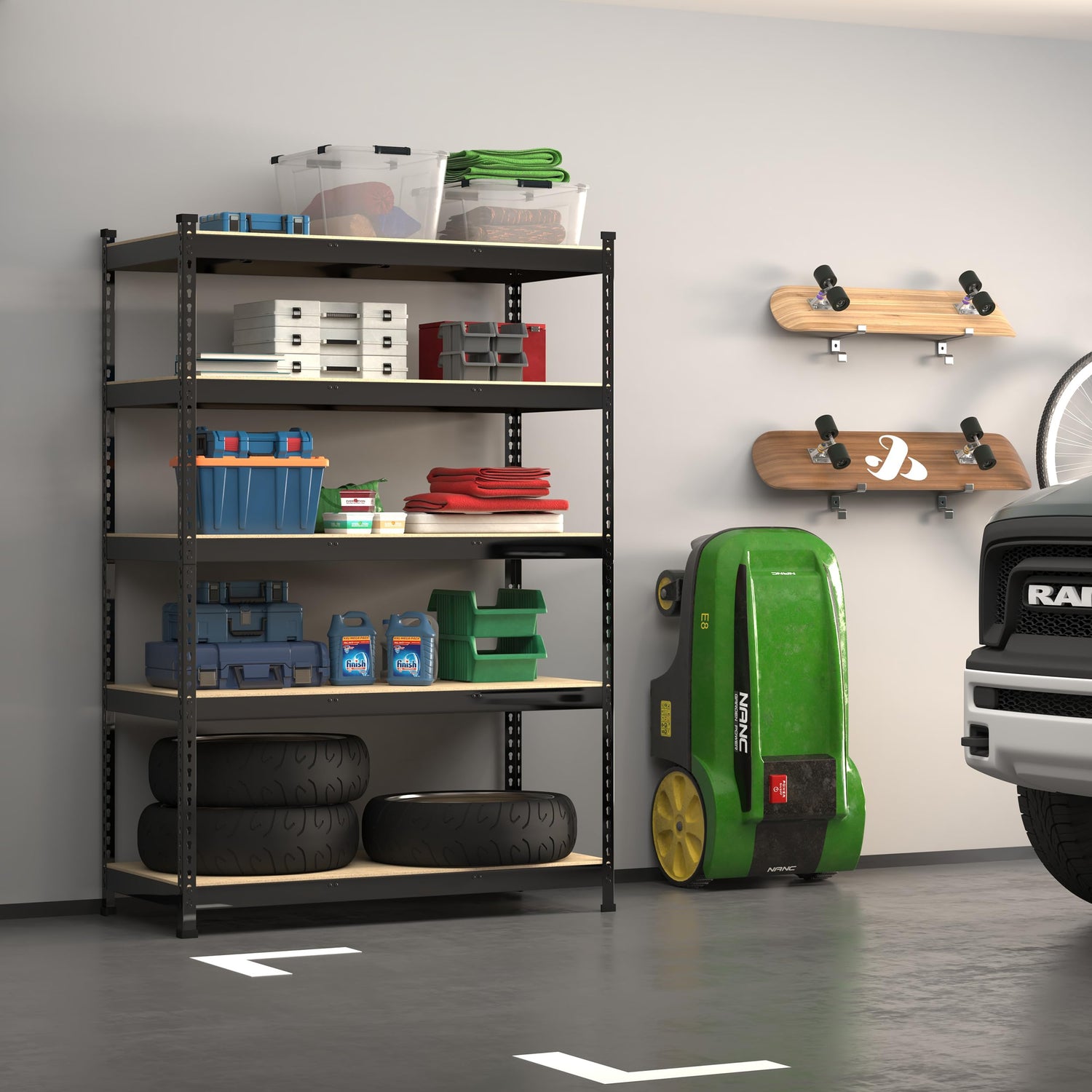 - 【HEAVY DUTY & LONG-LASTING】 : This 5-tier garage shelving is made of high-quality 0.23" thicker MDF boards and 0.04" thicker heavy duty galvanized metal frame, sturdy and enduring. The metal frame is covered with premium powder coating to give it a smooth surface. Each layer shelf add 2 middle support beam for more weight capacity. Each shelf holds up to 450 lbs, 5 tier shelves' total max load weight is 2250 lbs
