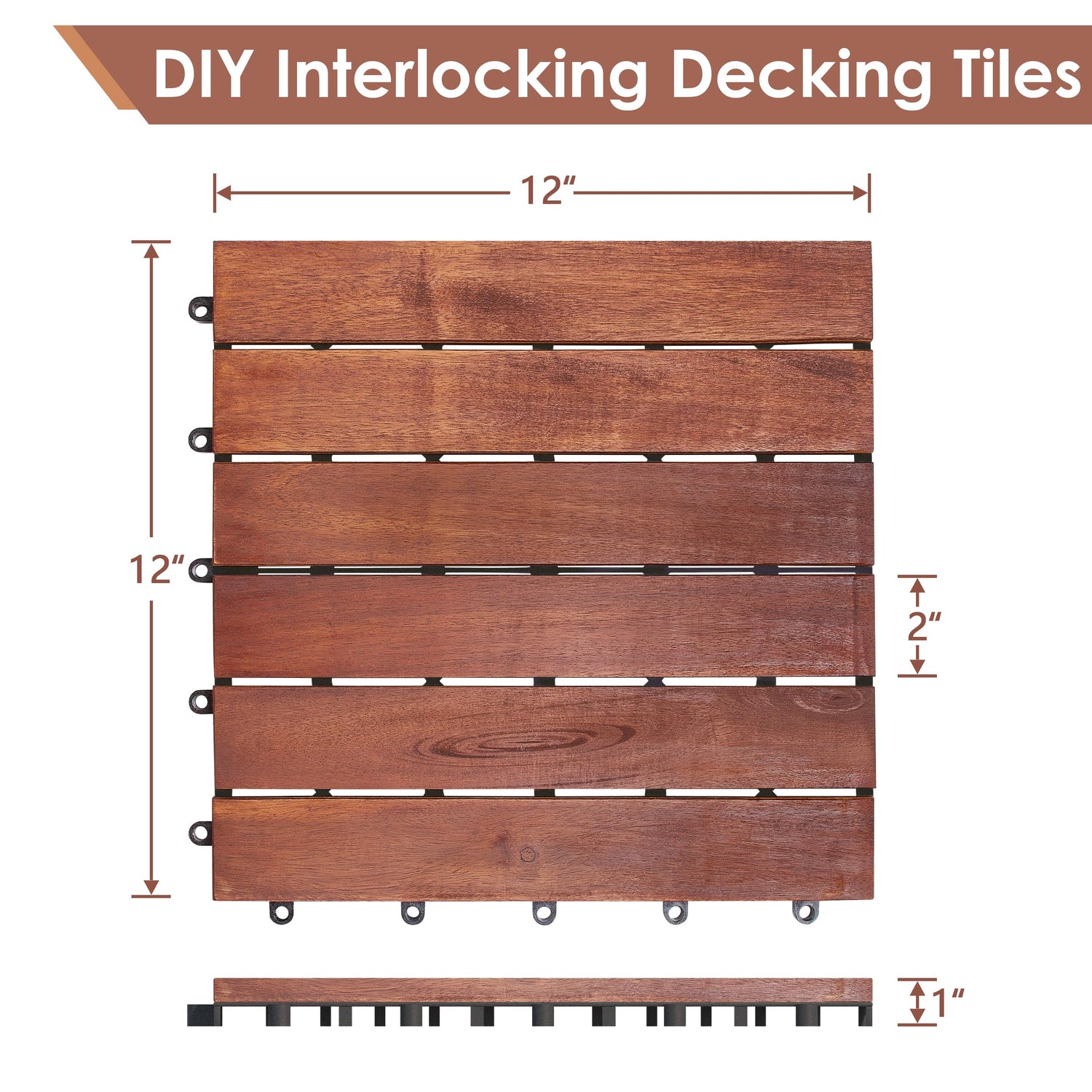 - 【Effortless DIY Installation】-Thanks for the interlocking design, our wood deck tiles can be installed or disassembled in minutes without professional installation or tools, making it easy for you to DIY. The interlocking design ensures the wood flooring stays in place and doesn't move around when in use. You can combine the outdoor flooring into various patterns or cut them to size to fit into tight areas, transform and enjoy your dream outdoor space and stunning new patio in no time with ease.