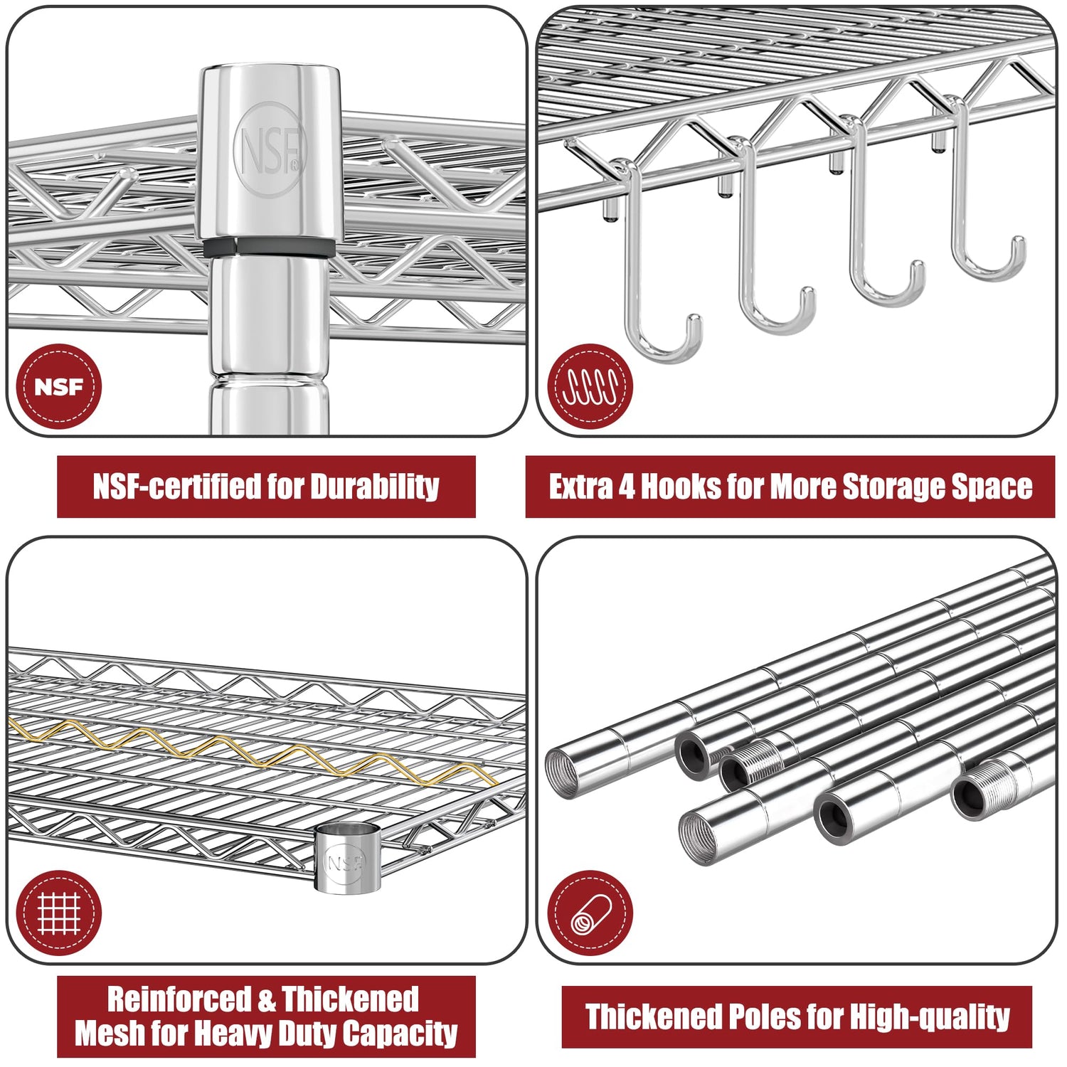 - 【Excellent Load Capacity】This wire rack is made of chrome alloy steel, has excellent anti-rust. Shelves with a strong and enduring structure composed of bolded metal wire and industrial high-strength metal rods, The total weight capacity of 4 shelves is up to 2,400 lbs without wheels, with each shelf supporting up to 600 lbs, so even a large number of heavy items can be stored reliably. (Note: When wire shelving unit is on wheels, the total load capacity is only 800 lbs)