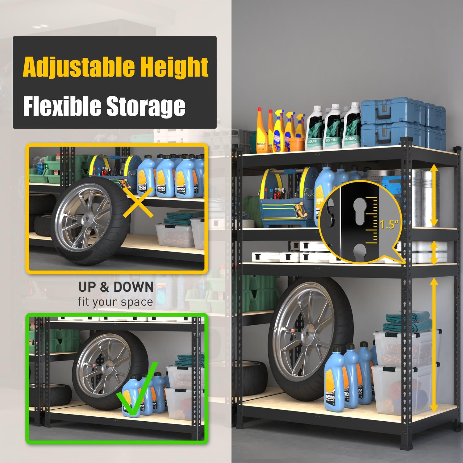 - 【Height Adjustable】Adjustable storage rack, metal shelving unit can be adjusted the shelf up and down, you can adjust each shelf heigh according to the size of the item so that the items can be stored in any size. (Adjustable at every 1.5 inches)