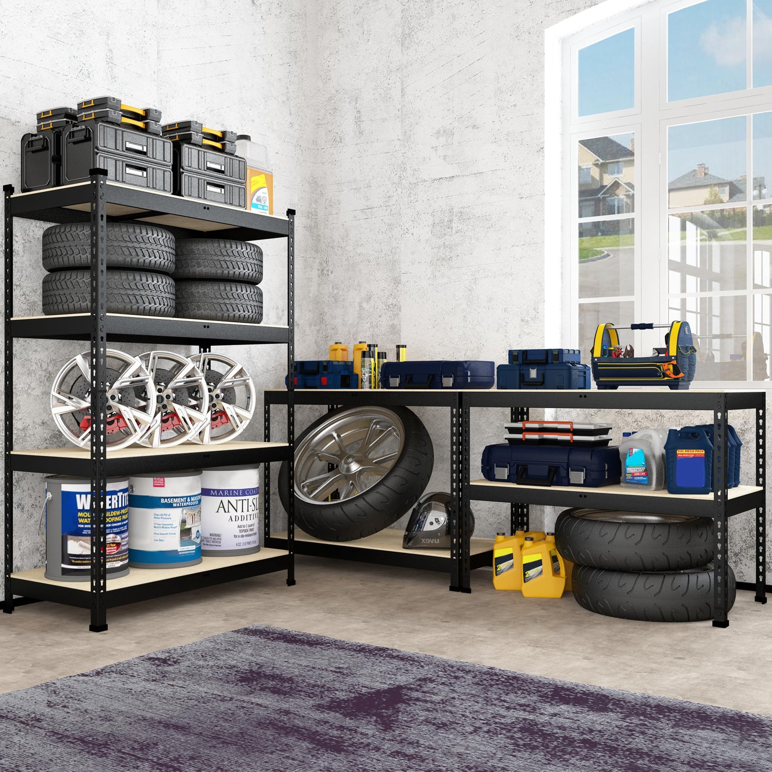 - 【 Heavy Duty & Long-lasting】This 4-tier garage shelving is made of high-quality thicker MDF boards and 0.03" thicker heavy duty galvanized metal frame, sturdy and ensuring. The metal frame is covered with premium powder coating to give it a smooth surface. Each shelf holds up to 400 lbs, 4 tier shelves' total max load weight is 1600 lbs