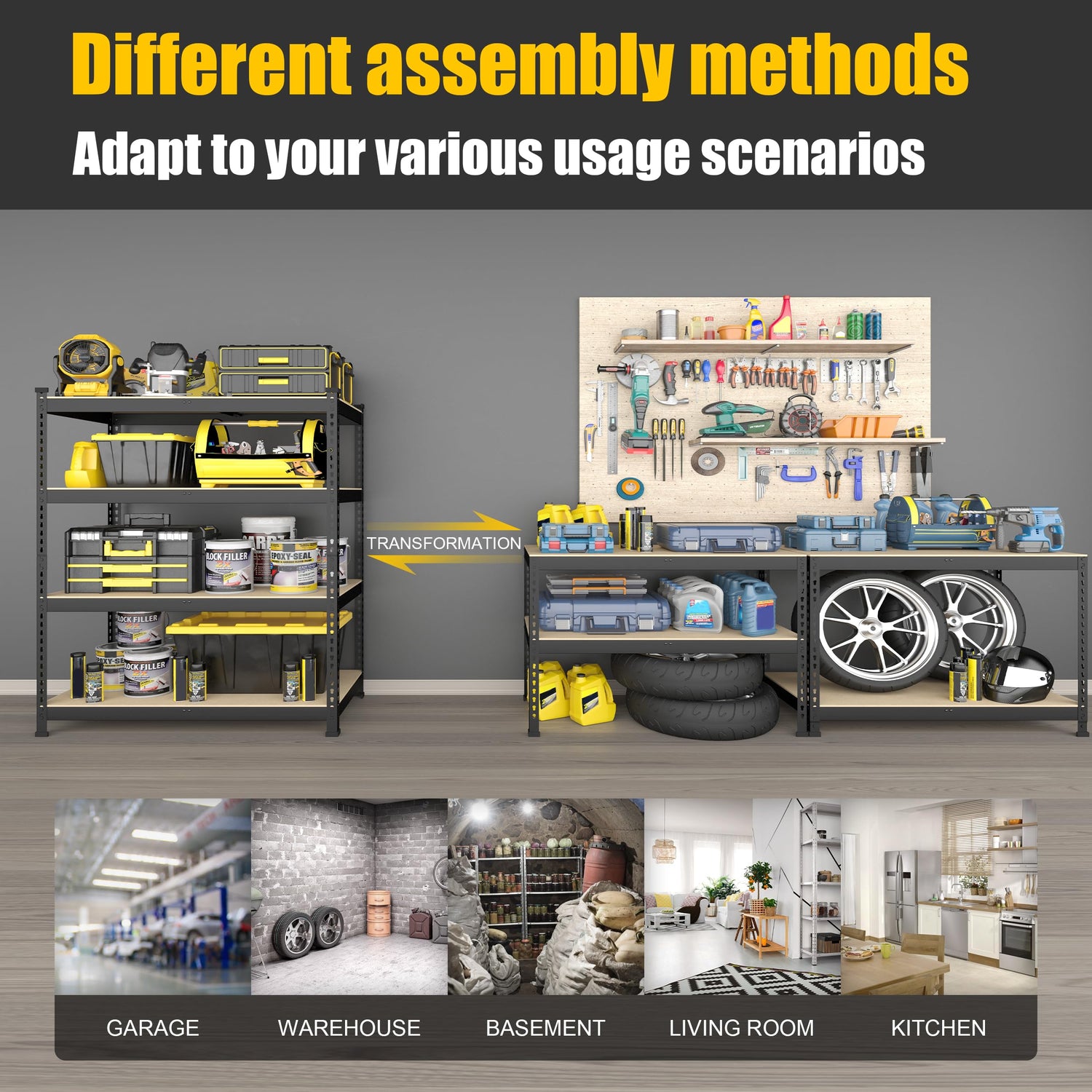 - 【Easy to Assemble 】Due to the boltless design, it is easy to assemble this heavy duty storage rack by lightly pressing it even with your hands or a rubber hammer. Assembling takes approximately 10 minutes. All hardware and the Installation Manual are provided, including the rubber hammer and gloves.